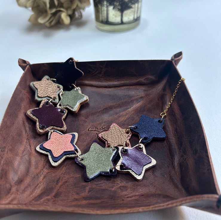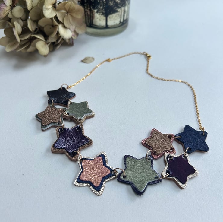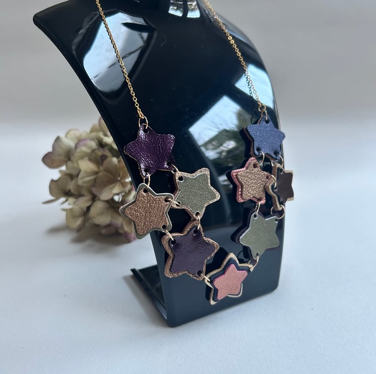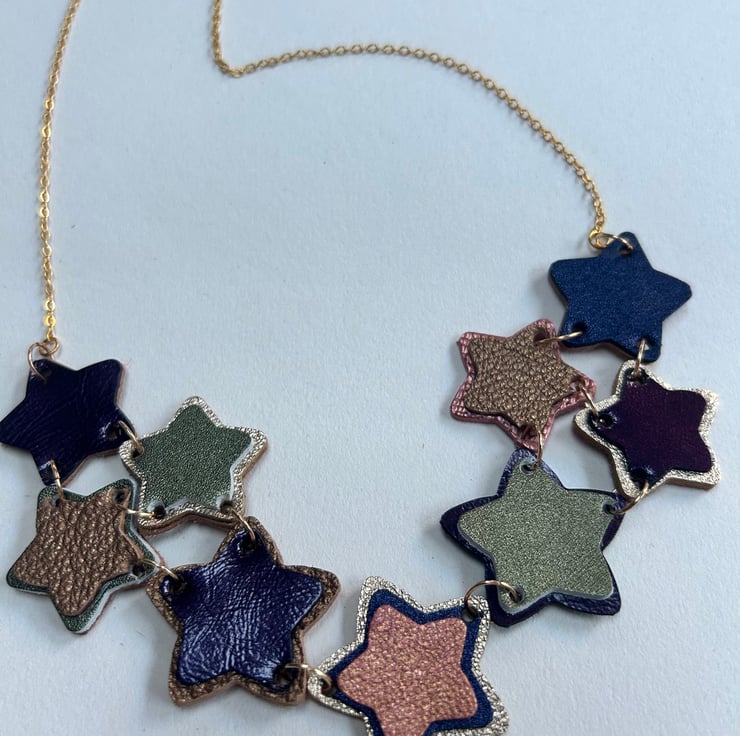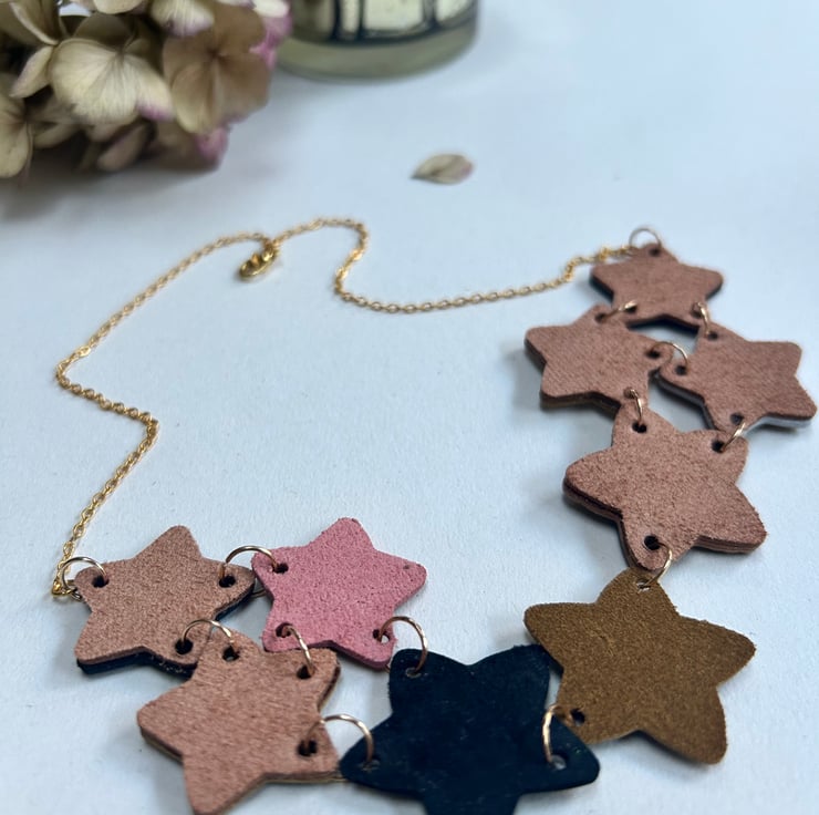 The stars are made from layering different colours and sizes of leather together to make a 3 dimensional shape. The stars are joined together with gold coloured hypoallergenic jump rings along with a gold coloured hypoallergenic chain.