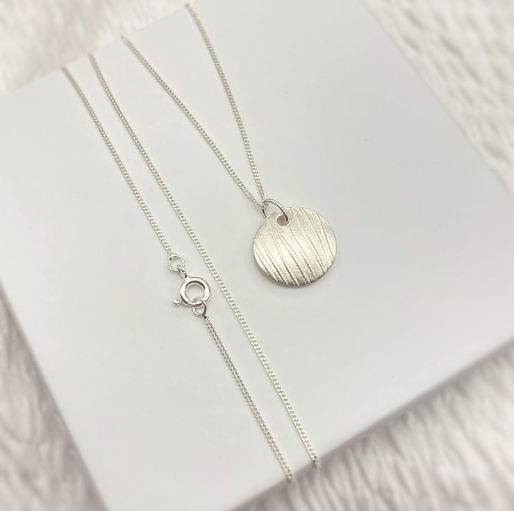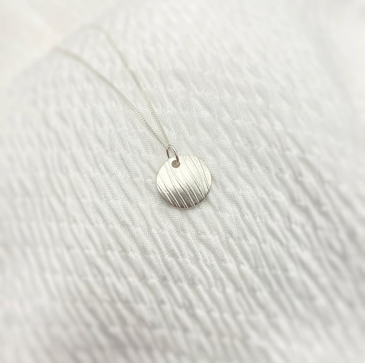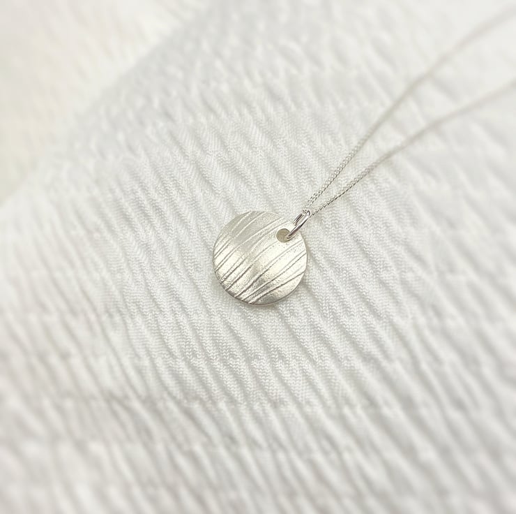 This elegant pendant has been made using Art Clay Silver. Once fired the pendant is 99.9% fine silver. The disc has a slight concave curve, the texture is inspired by delicate reeds blowing by the water's edge.