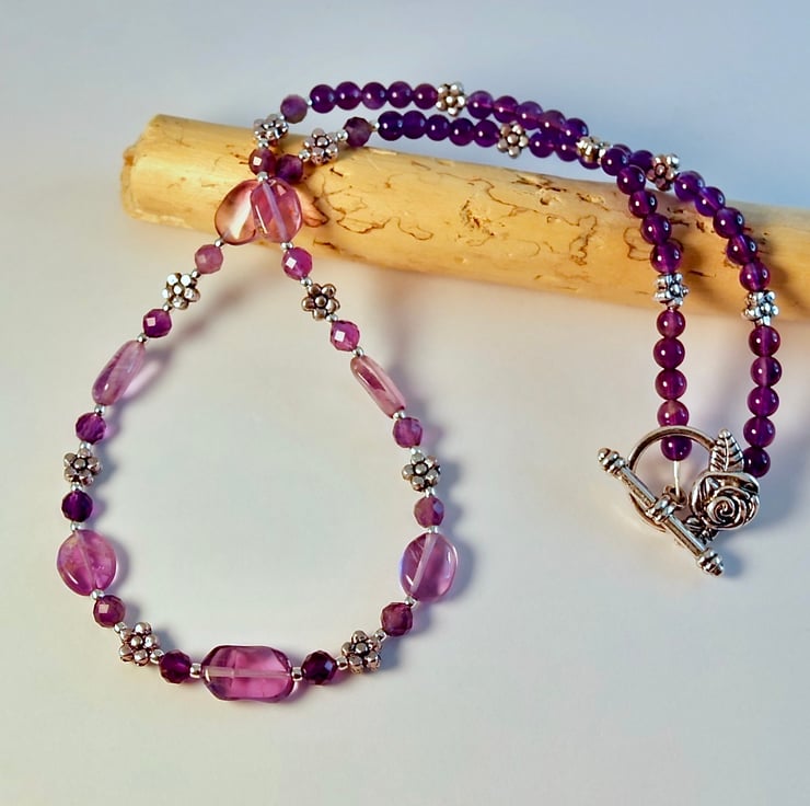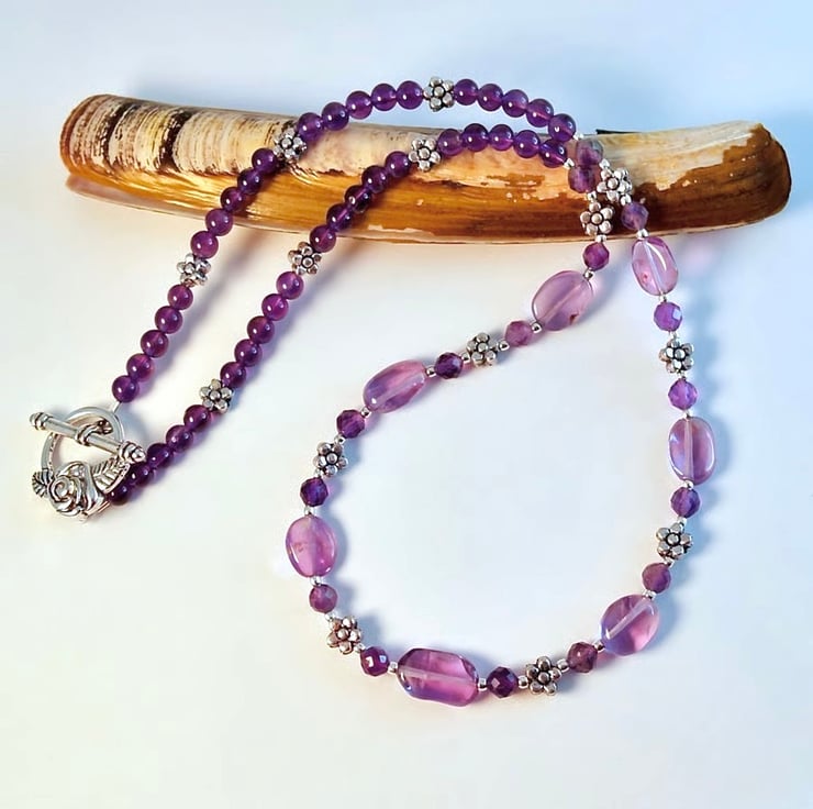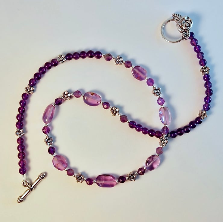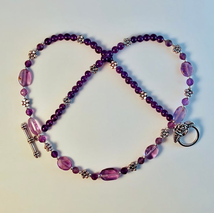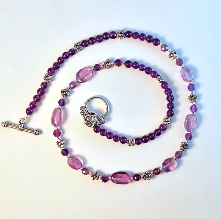 The necklace then graduates to A grade, 4mm deep purple Amethyst round beads, further embellished with Tibetan silver flowers, and fastens with a Tibetan silver rose toggle clasp.