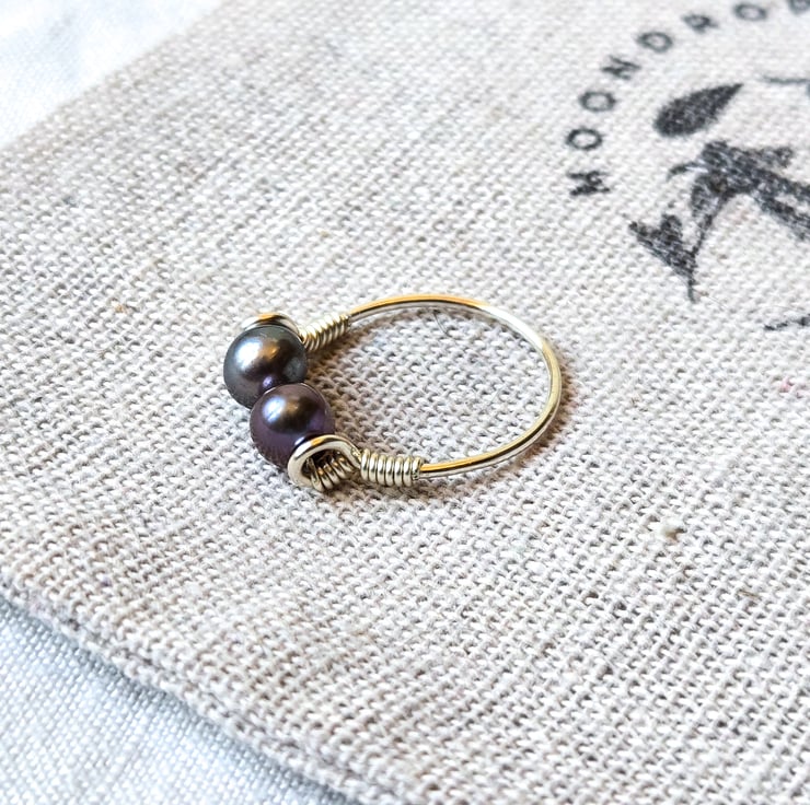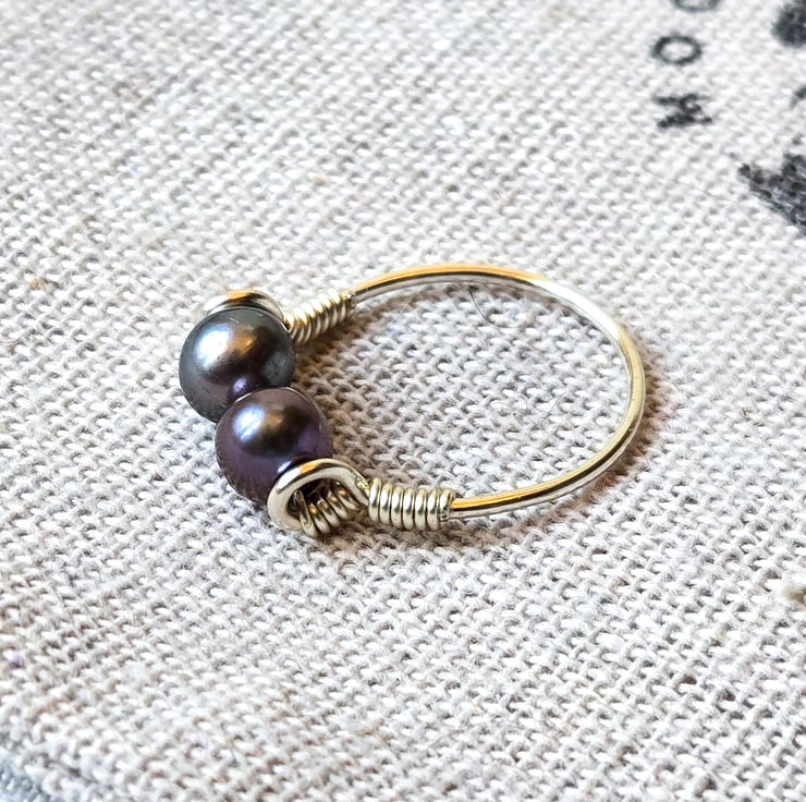 Carefully hand-wrapped with recycled sterling silver wire, this ring features two stunning baroque (near round) freshwater pearls in a rich peacock purple/blue hue. They've got a lovely shimmery surface and reflect beautifully in the light!