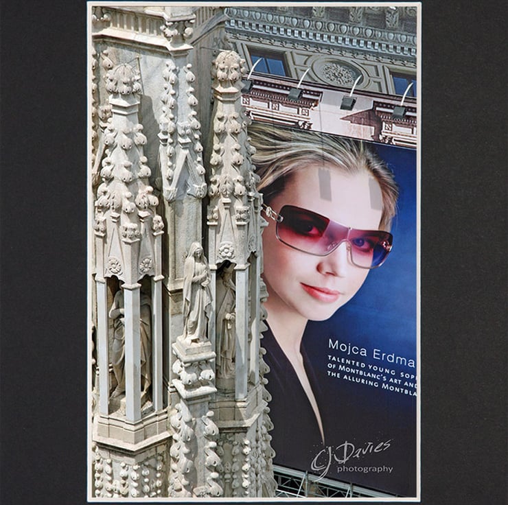 Taken from the roof of the Duomo at Milan, I was taken by the contrast of the cathedral's stonework and the large poster behind.