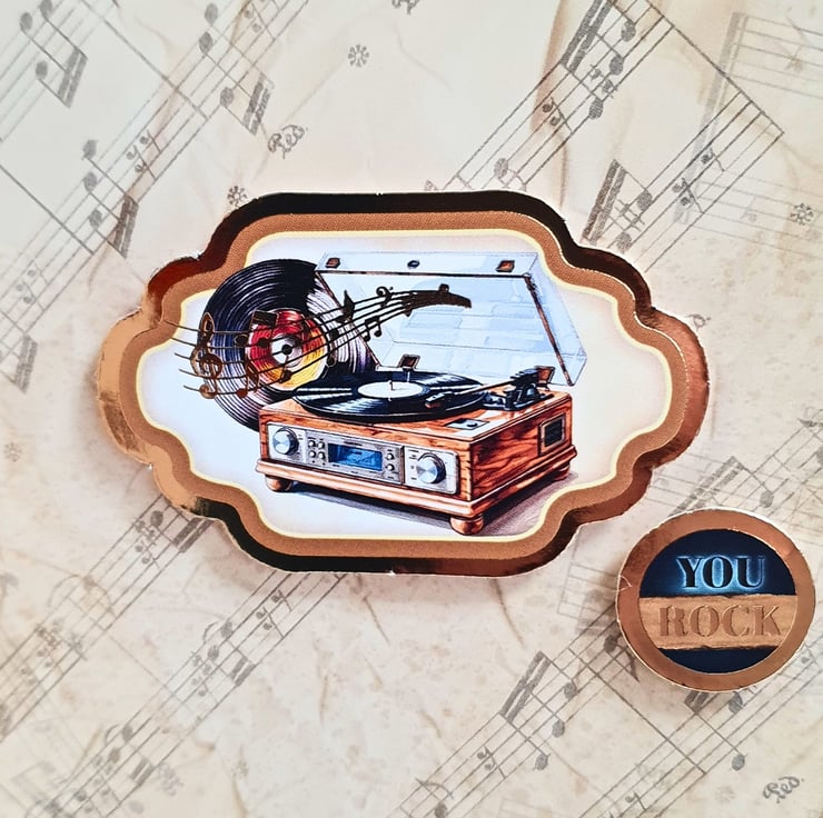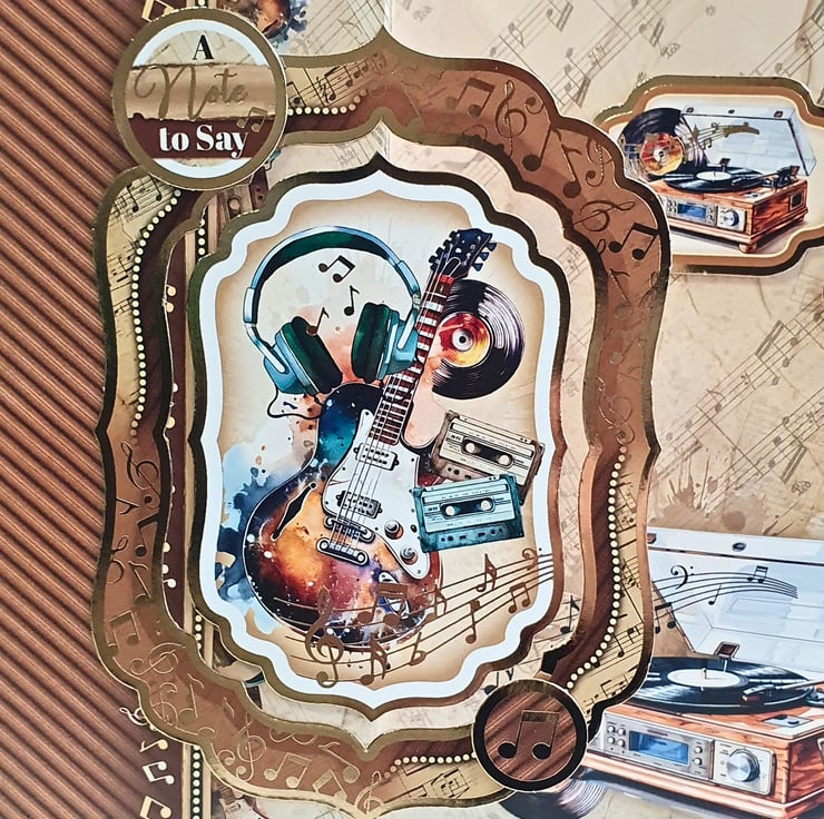 It consists of luxury cardstock in beige - brown shades, printed with music related images & borders. Musical notes, a guitar, an old record player, music tapes, headphones, vinyl records, they all bring back memories from a different era! It is decorated with gold foiled matching toppers & two sentiments tags that read "A Note To Say" & "You Rock". The card is finished with gold diamante & a matching insert at the back, that has been left blank, giving you plenty of room for your messages & wishes.