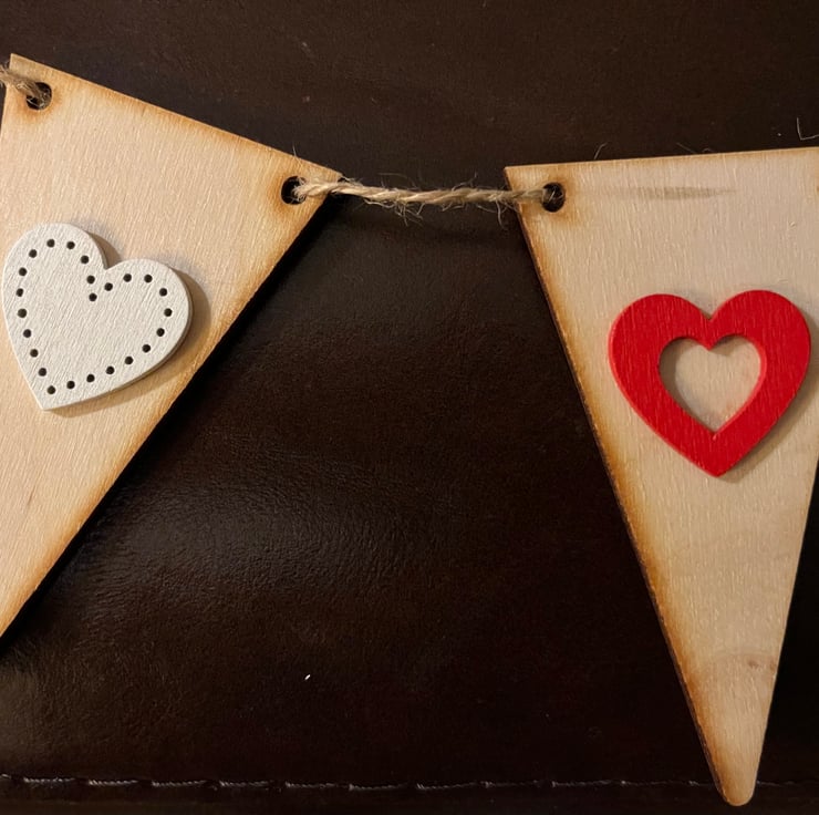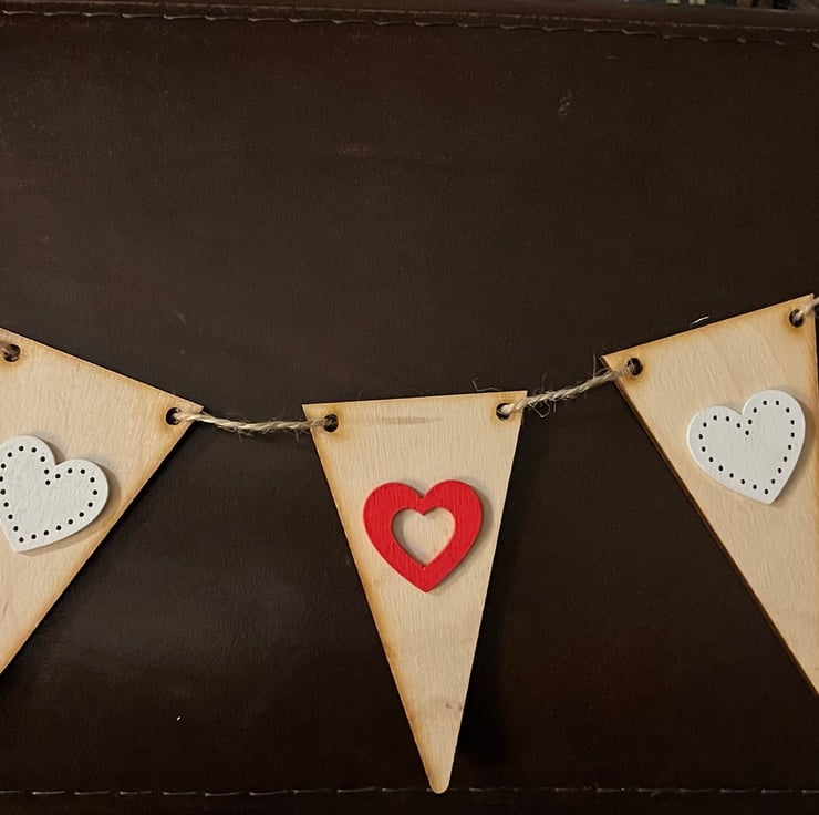 Gorgeous heart shaped, wooden bunting, There are 5 flags in this garland and each flag is approx 4.5cm wide by 8cm long. There are a mix of small red and white hearts stuck onto the flags. UK only.