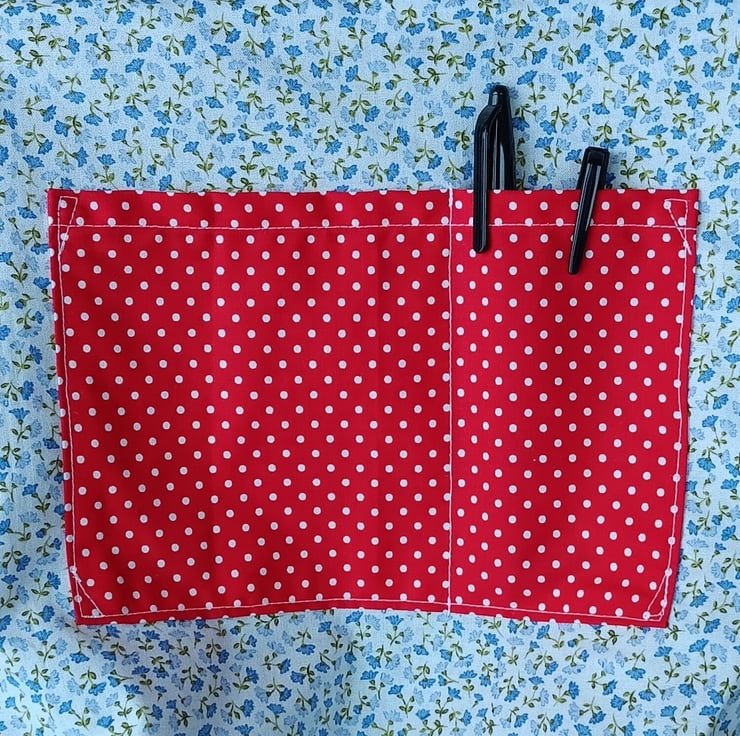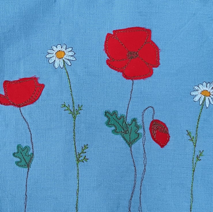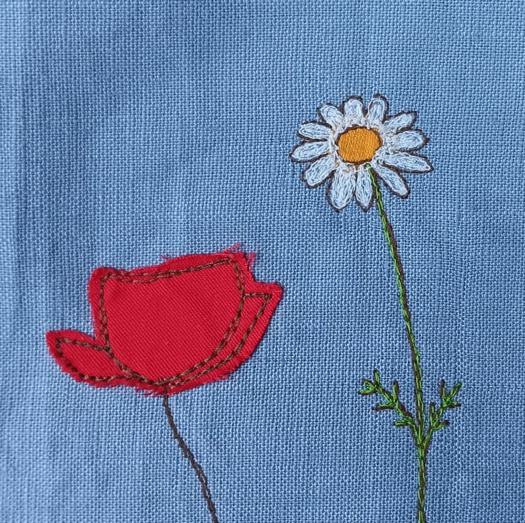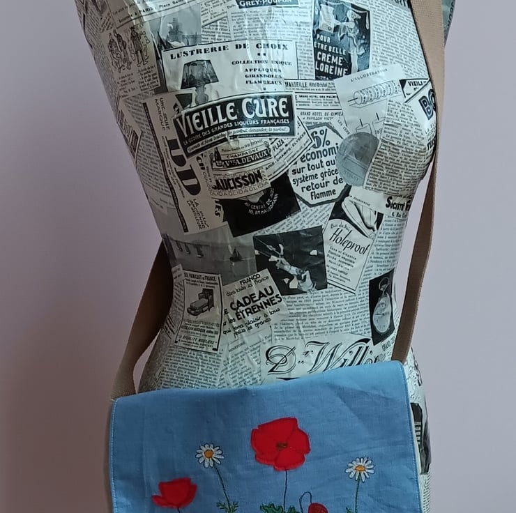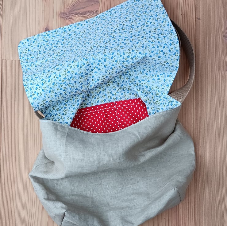 A beautiful and unique linen messenger bag with a poppy and daisy design. The main body of the bag is made from beige linen, and the flap from blue linen. On the flap are embroidered poppies and daisies sewn using free motion embroidery. The inside lining is in a lovely blue flower cotton fabric, with a double pocket in red polka dot, perfect for pens, keys, purse etc. The bag measures approximately 33cm wide and 28cm deep. The flap measures about 24cm. The strap is made from a sturdy beige webbing and measures approximately 1 metre.