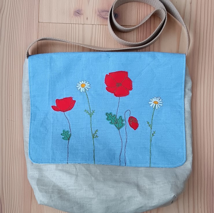 Linen Messenger Bag with Embroidered Poppies and Daisies