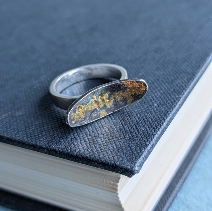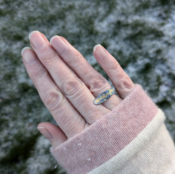 This unique oxidised silver ring has been created using the traditional keum boo technique. The top of the ring has a domed oval of silver with a beautiful pattern created from 24 kt gold foil.