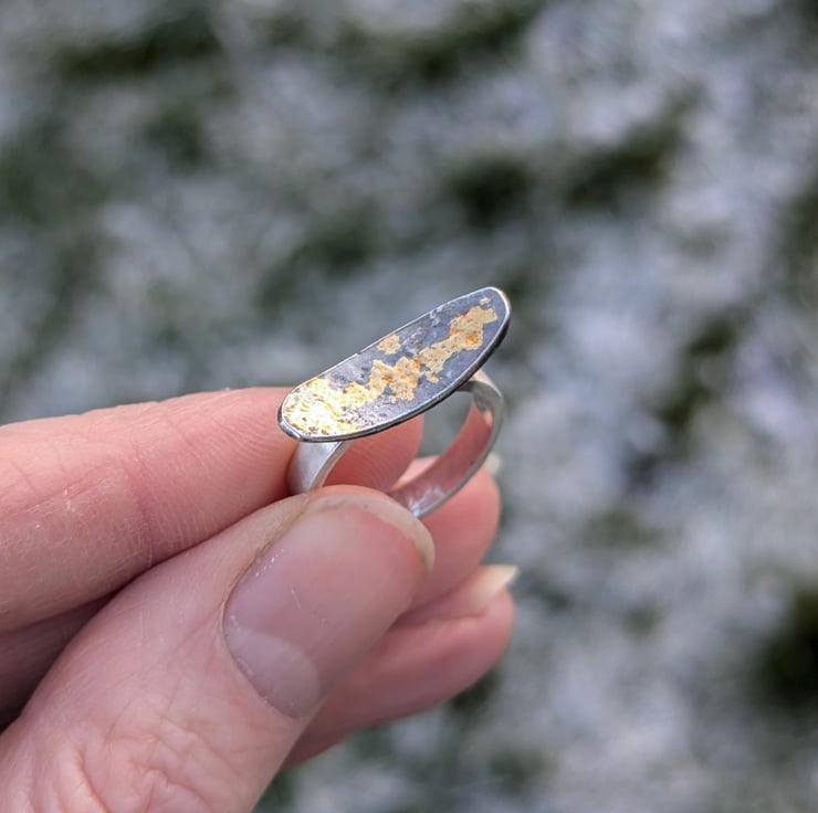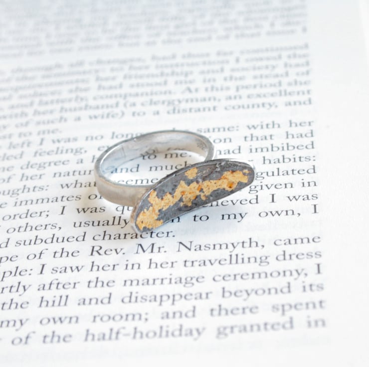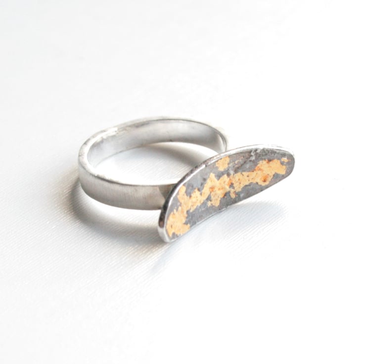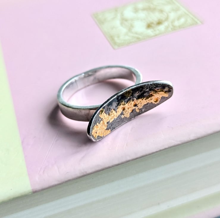 The ring is created from sterling silver which is heated until the surface begins to melt creating an uneven surface. The silver is then heated again and very thin gold foil is applied to the surface, Applying a patina to this ring creates the black finish which looks beautiful against the gold. The ring band is left silver.