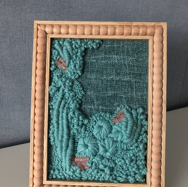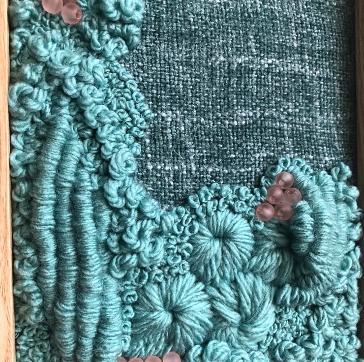 Laguna bay a one of a kind ,framed, hand embroidered art piece. Embroidery thread, yarn and beads have been hand stitched onto a teal fabric in an abstract pattern the finished piece has then been placed in a decorative wood frame. This has created a piece which is both eye catching and unique a perfect addition to any home