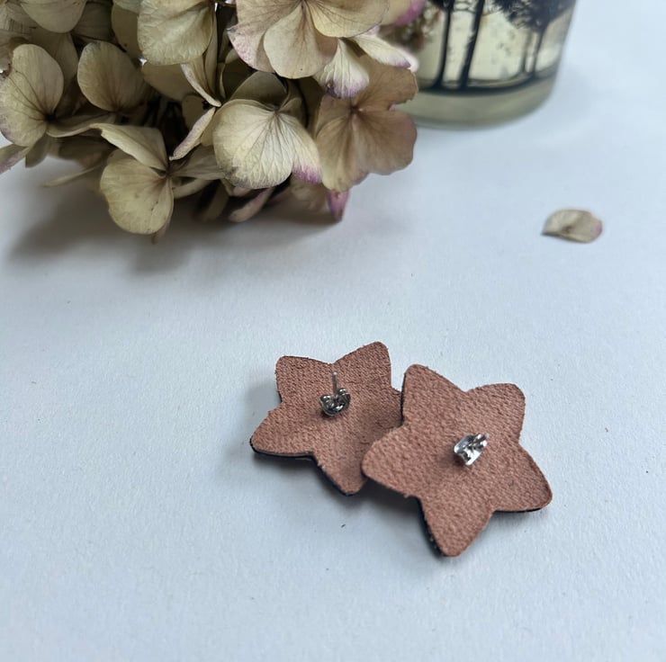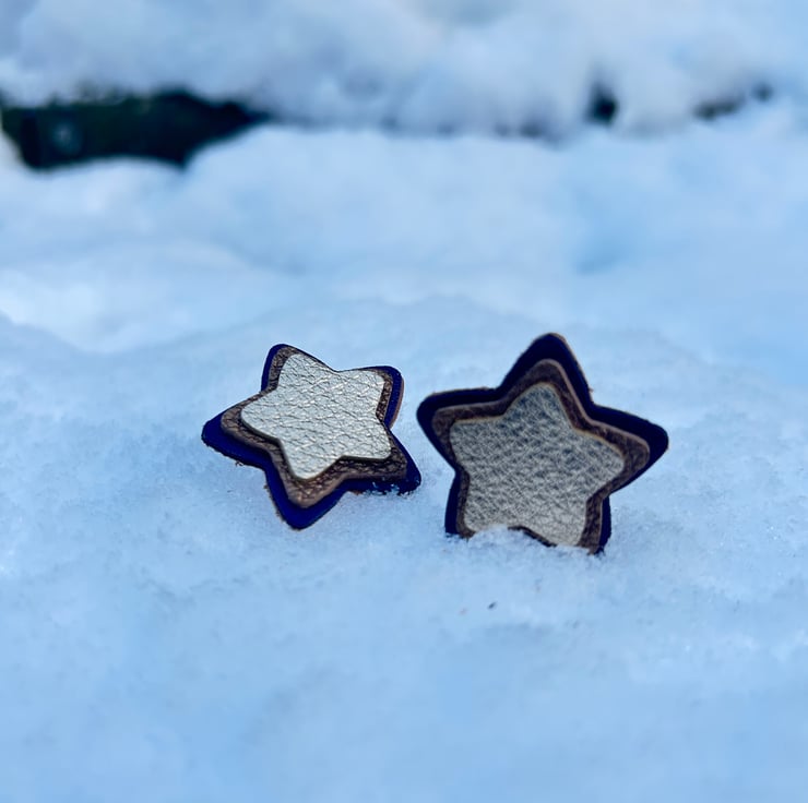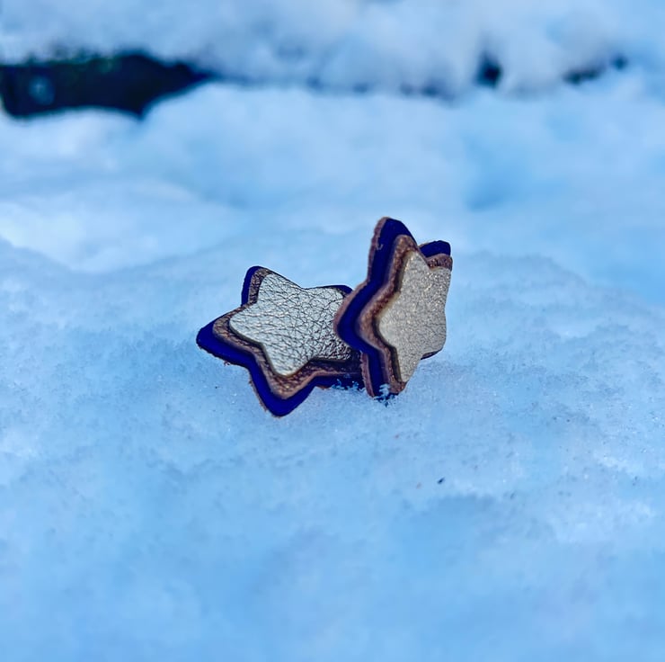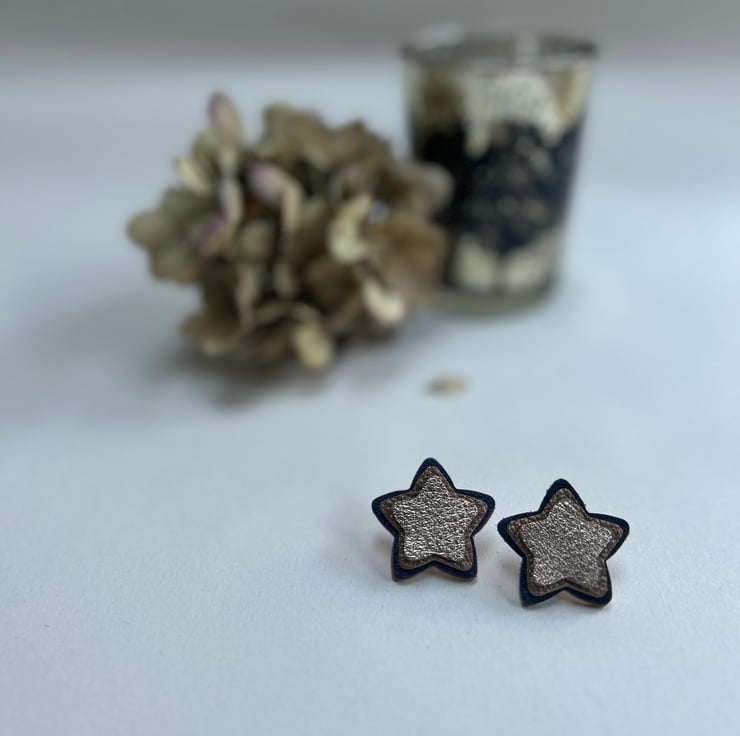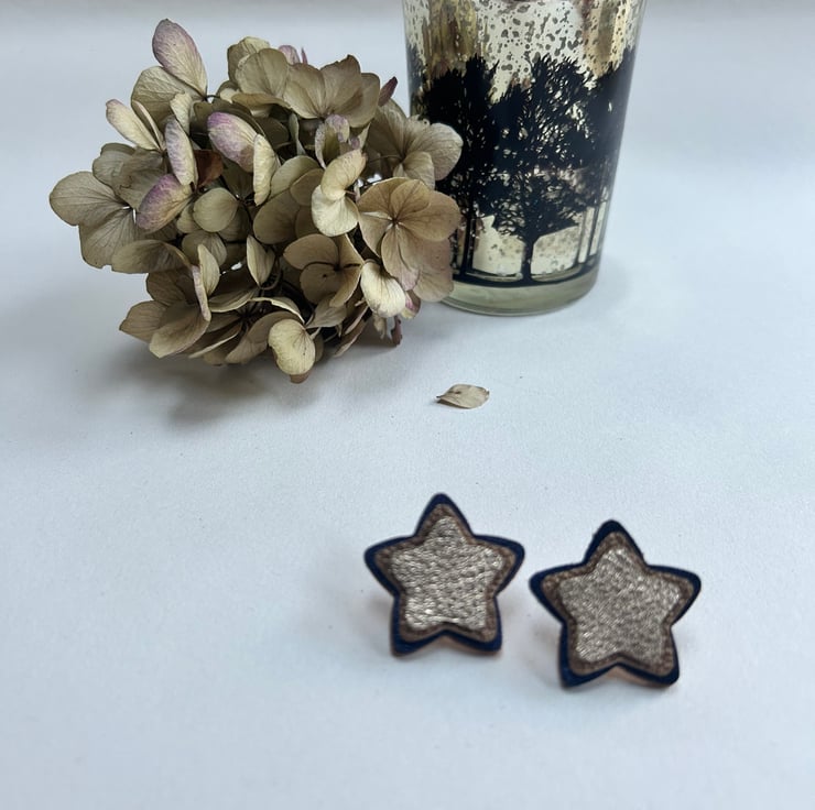 Star leather earrings are made from layering different colours and sizes of navy blue, bronze and gold metallic leather together to make a 3 dimensional shape.