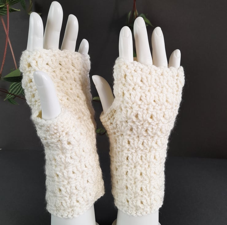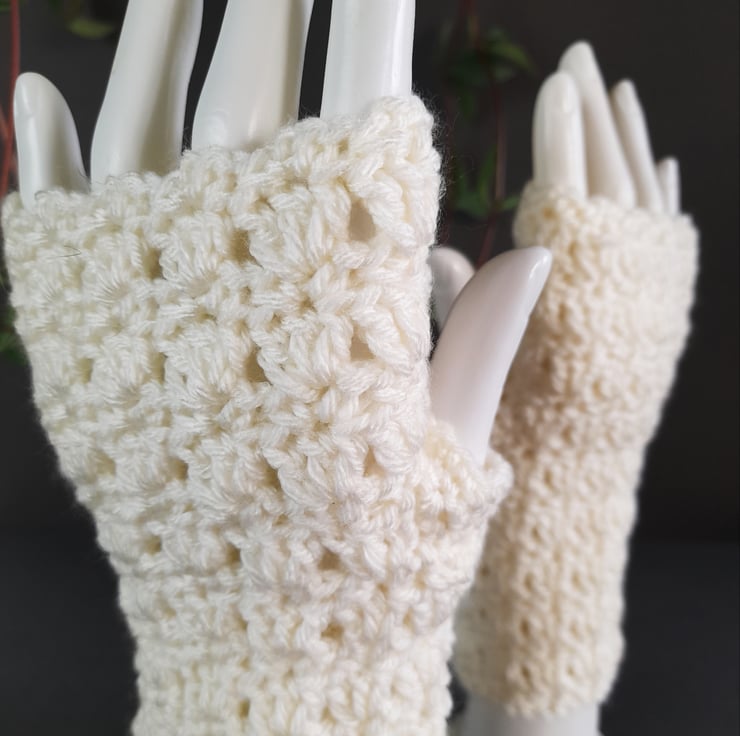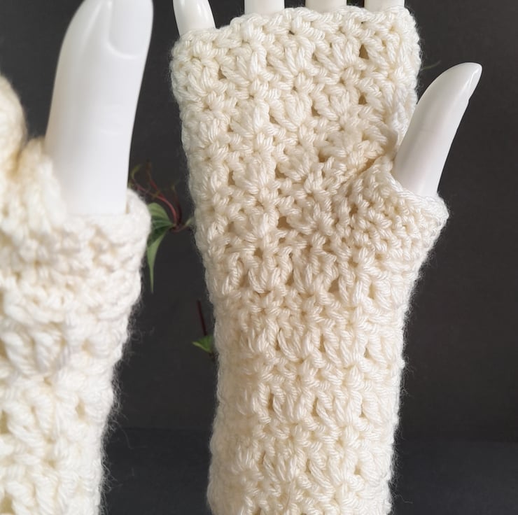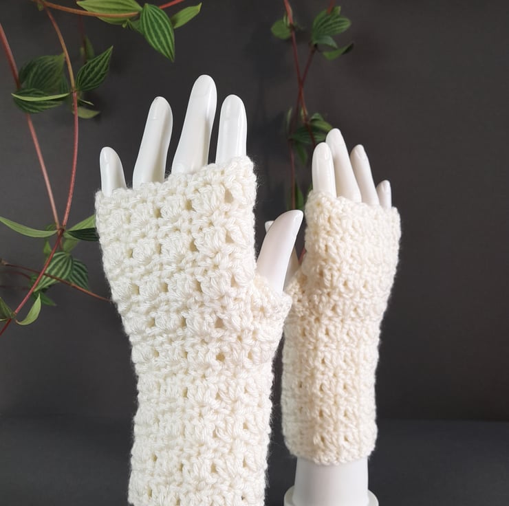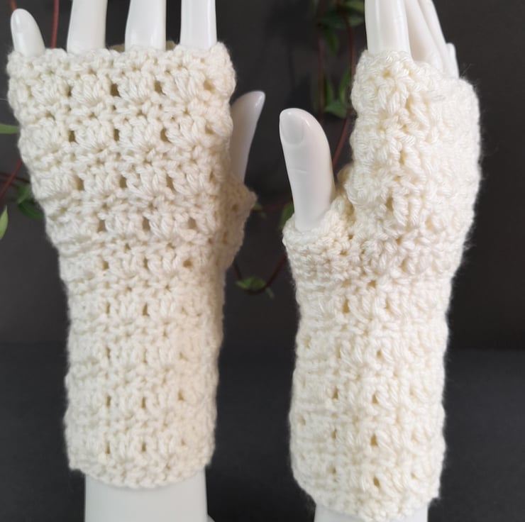 I make my popular fingerless mitts with a lovely soft and smooth yarn, using a pretty crochet shell stitch. I give them a partial thumb and a generous length on the fingers and the wrists, for comfort and warmth.