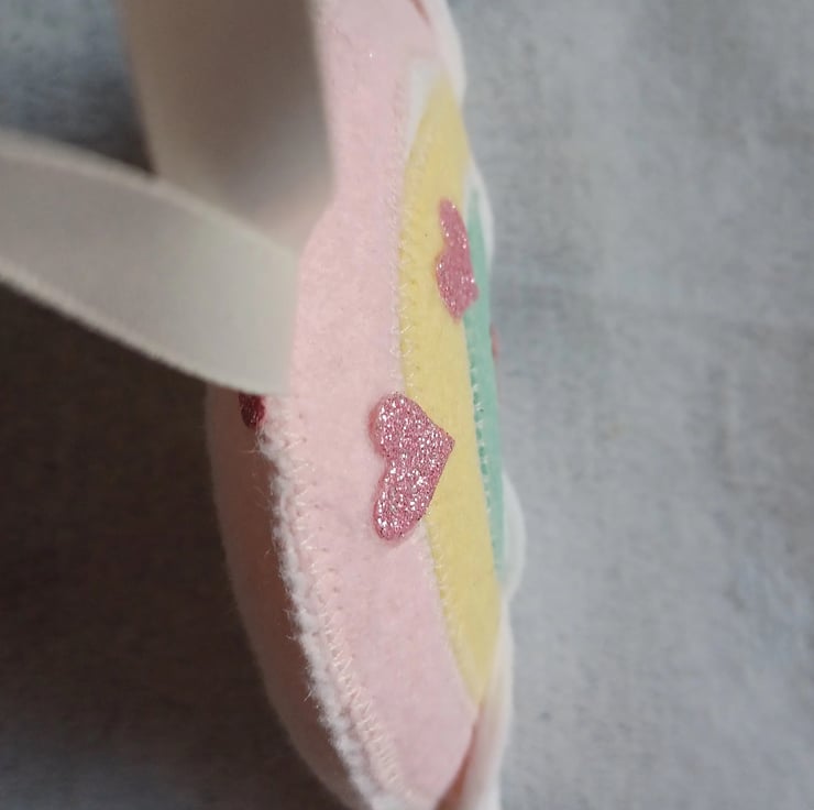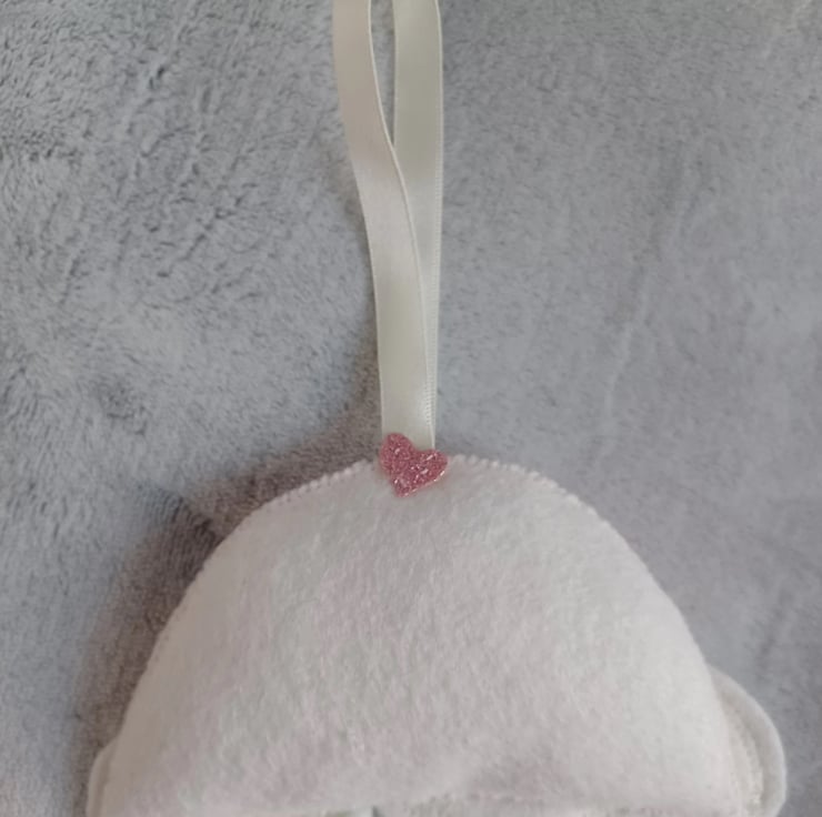 This has been machine and hand sewn, and is filled with safety toy padding and hangs on ivory ribbon.