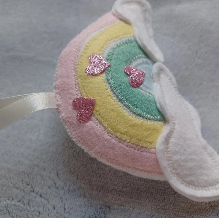A handmade felt rainbow - pastel shades - with clouds and pink acrylic glitter hearts.