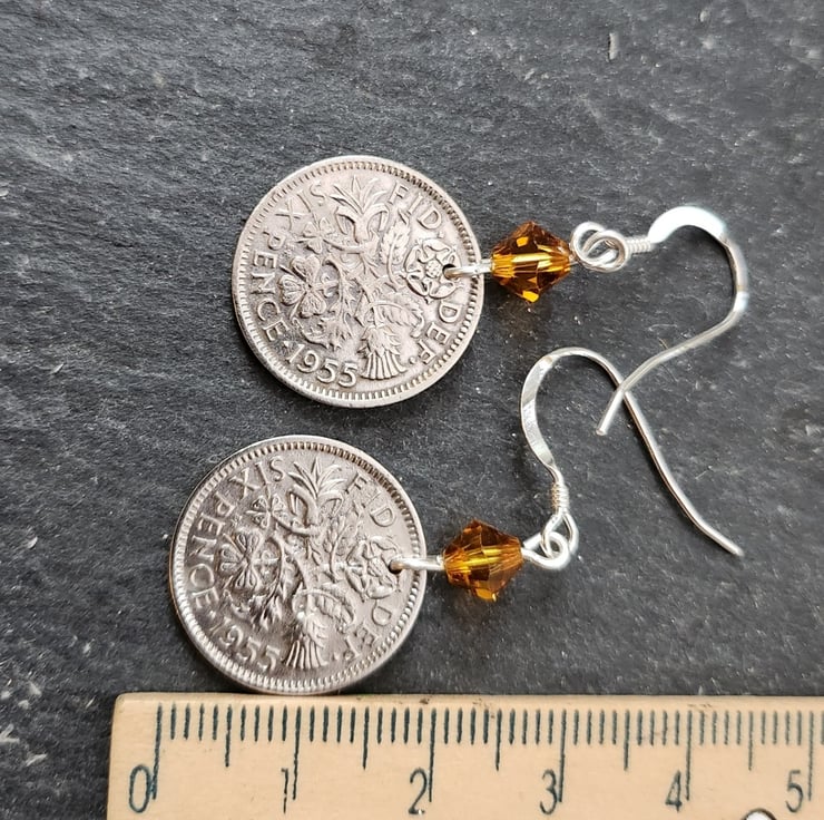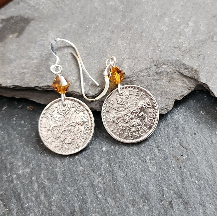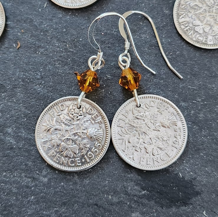 Pre-decimal sixpence (6d) coins from 1955, ideal for a 70th birthday present this year. The ear wires are sterling silver, however, the sixpence by this time had no silver content whatsoever, they are cupronickel. Gold coloured preciosa crystals. Approximately 3cm drop.