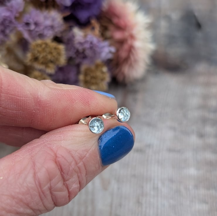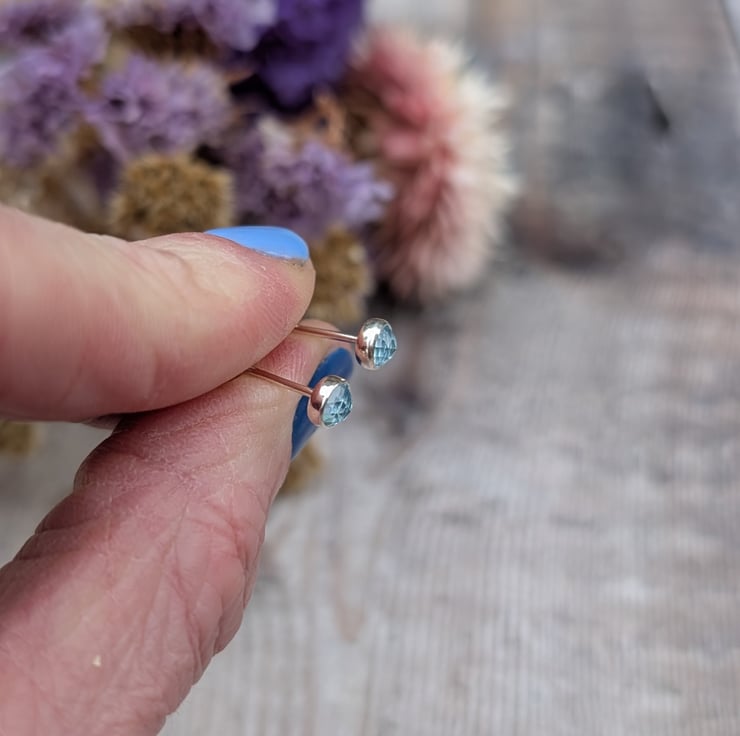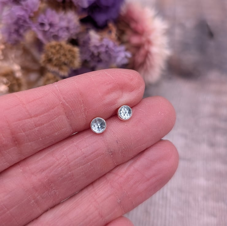 These handmade earrings feature sparkling rose cut aquamarine gemstones, bezel-set in recycled sterling silver for a sleek and timeless design. The soft blue hues of the aquamarine catch the light beautifully, offering a subtle touch of elegance and serenity to your look.
