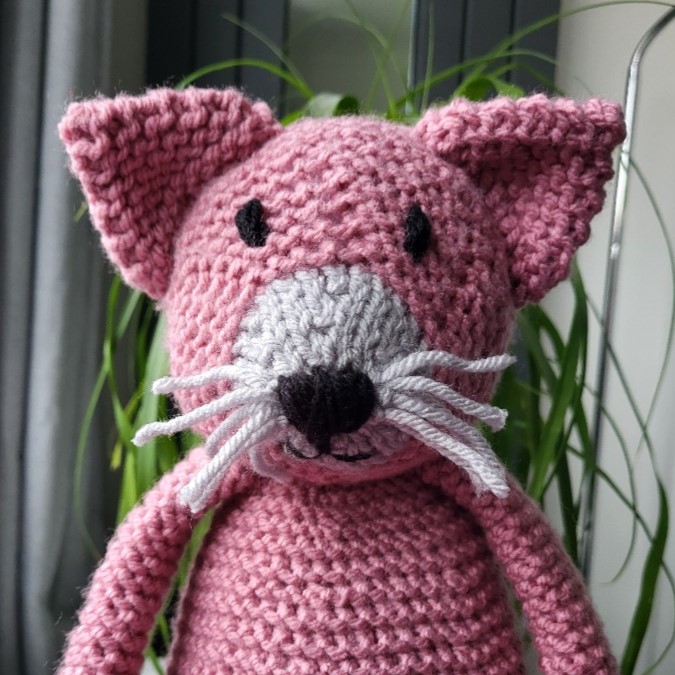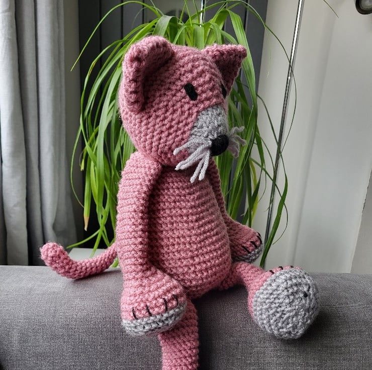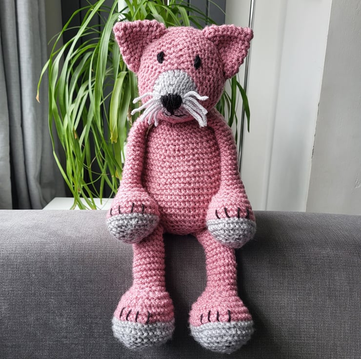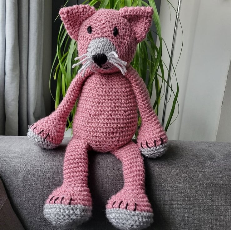This adorably cute and cuddly cat is hand knitted in chunky pink yarn, with grey paws and muzzle and black yarn detailing. He makes the perfect gift for a loved one - or for yourself!!!