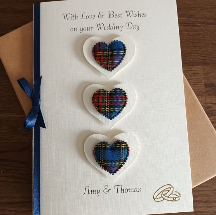 A beautiful, boxed Wedding Day card, personalised with the couples names. Ivory linen hearts with blue padded tartan hearts, golden rings and deep blue satin ribbon and bow running down the side of the card, these are raised from the card to give a 3D effect.