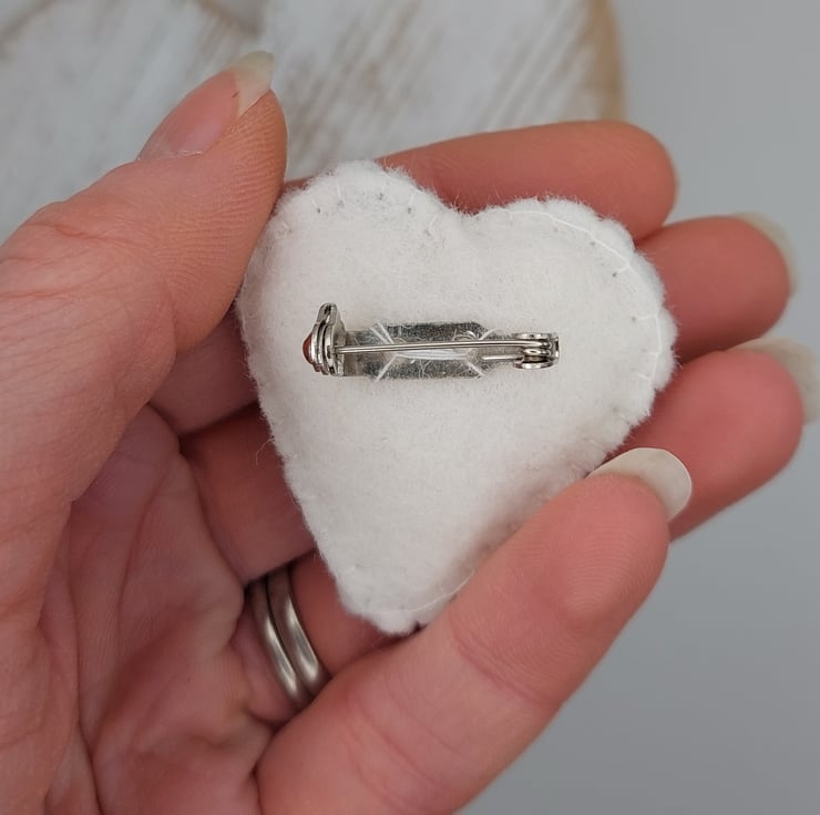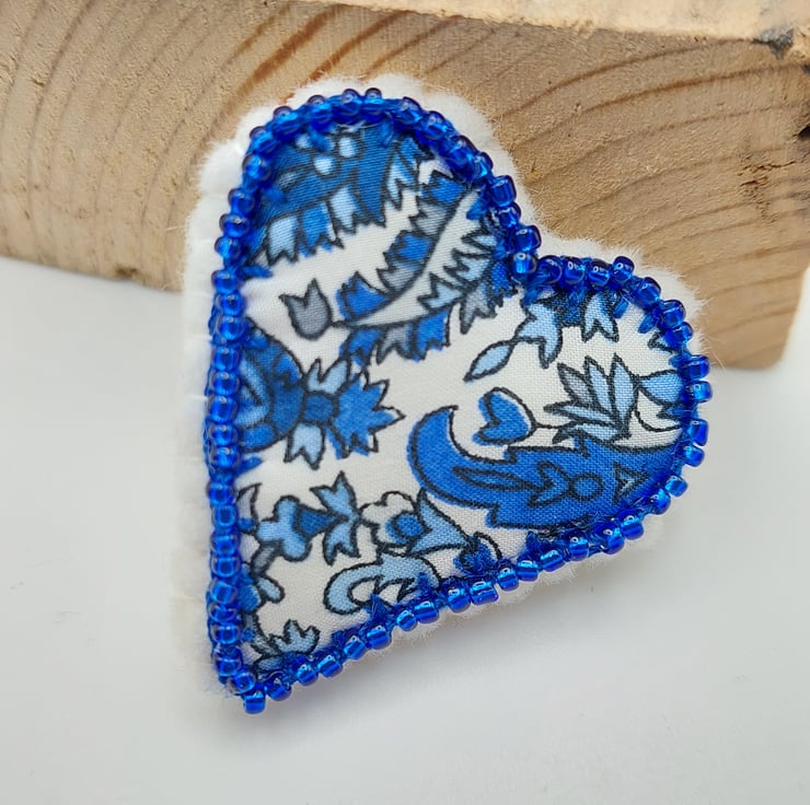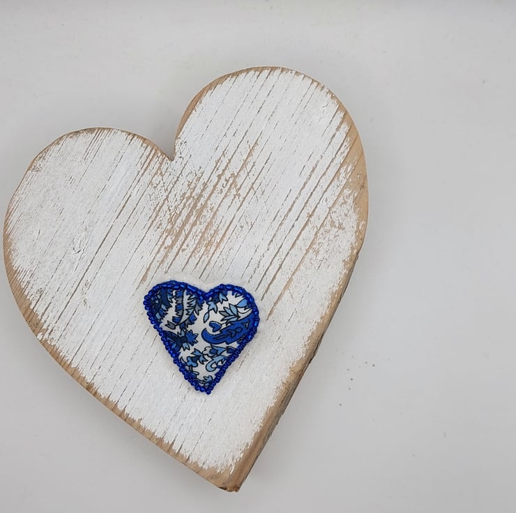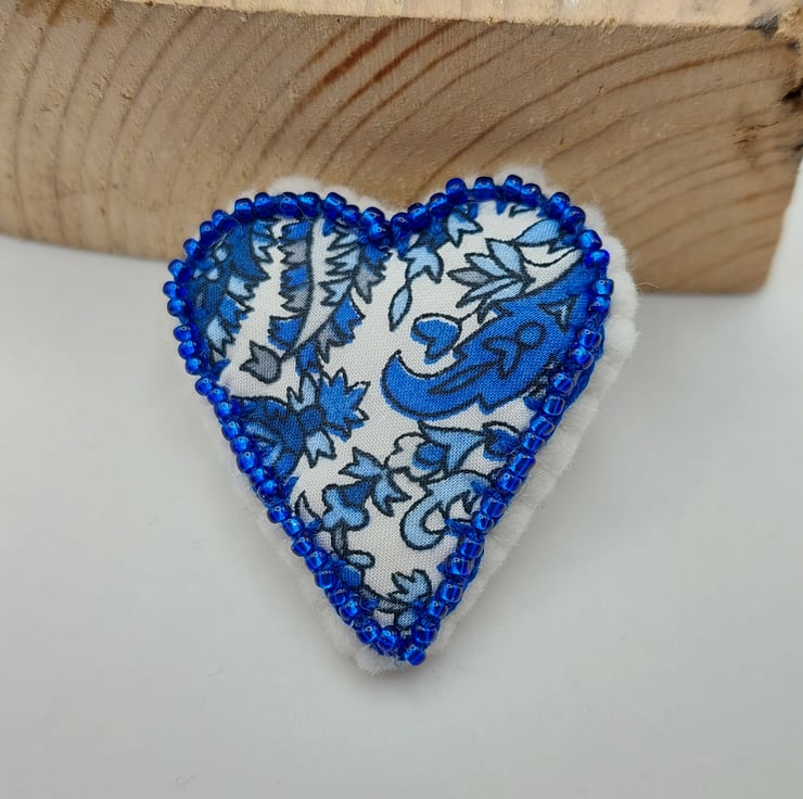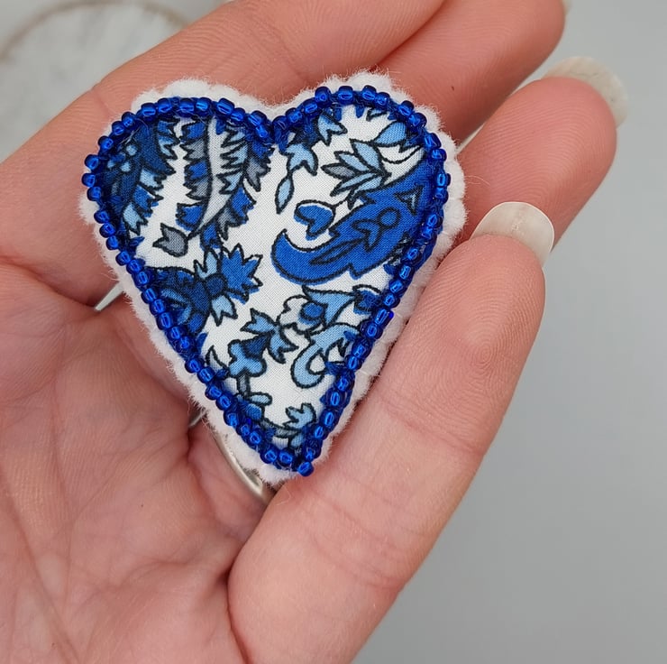 This elegant blue and white heart brooch is a lovely way to add a touch of charm to any outfit. Crafted with care, it features a heart-shaped patterned cotton fabric in blue and white, set on a slightly larger heart of soft cream felt. The edges are beautifully finished with a delicate blanket stitch. Measuring just over 4cm in diameter, this brooch is the perfect size for a subtle yet striking accent. Whether for yourself or as a thoughtful gift, it’s a beautiful way to add a handcrafted, unique detail to your wardrobe.
