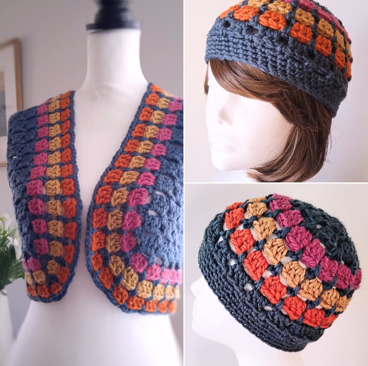 I love the crochet styles from the 1960s and 70s. This chunky bolero and cap set is from a Sirdar pattern in the 1960s. If you would prefer a different size or colour combination, please message me and I will create a custom order for you.