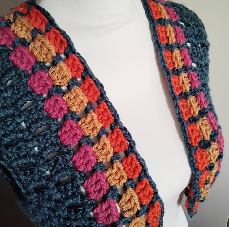 It is an original 1960s design featuring the granny square stitch for a timeless look. The design is from a vintage crochet pattern from Sirdar in Wakefield. I have replicated the design with a chunky acrylic/wool blend, matching the original colours as much as possible.