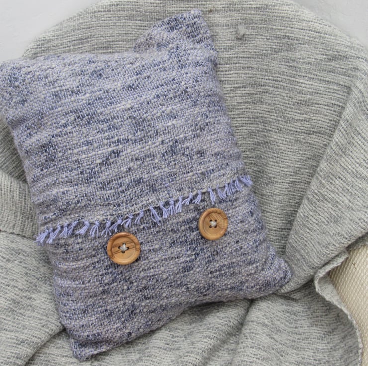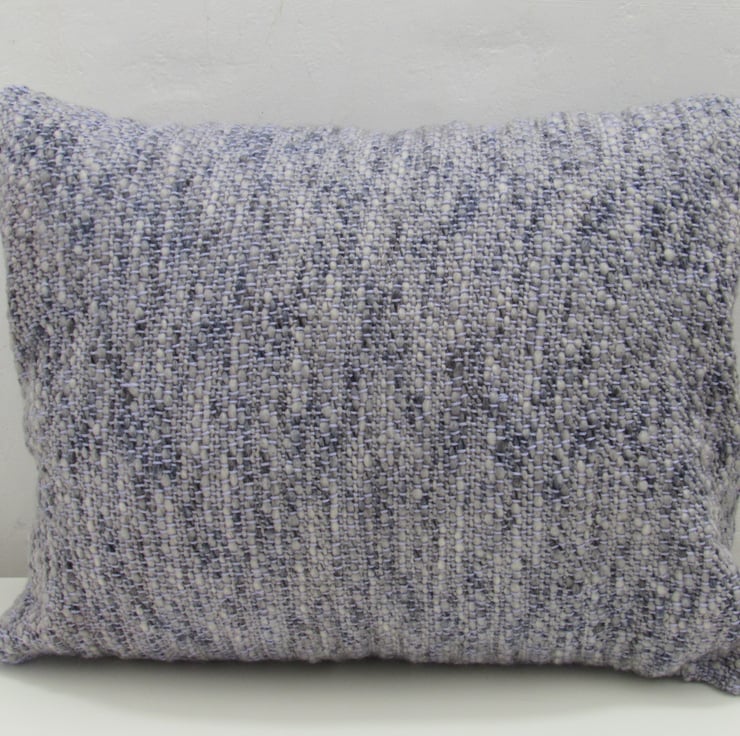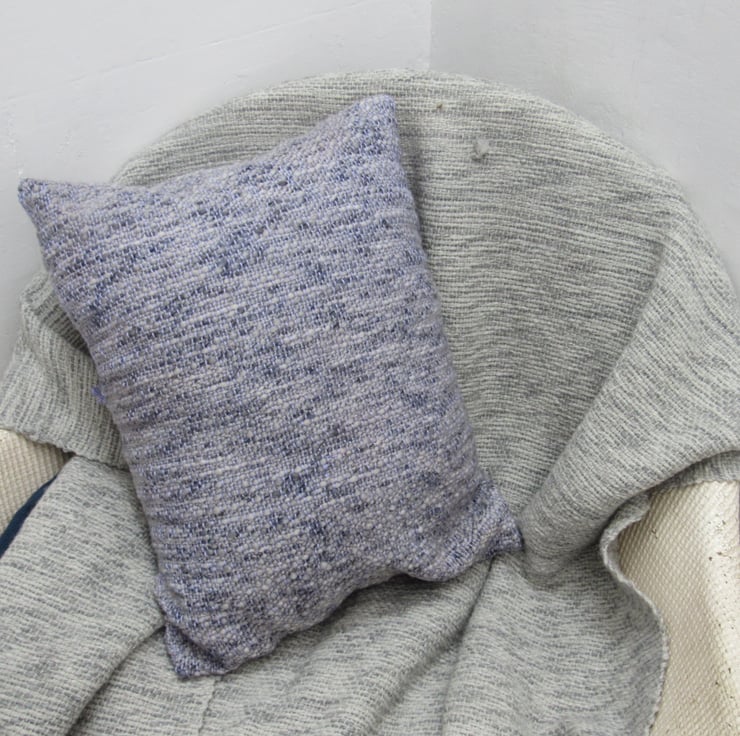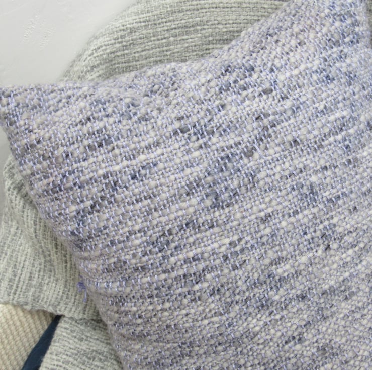 Handwoven cushion cover made from soft 3-toned grey alpaca yarn and a light purple cotton.
