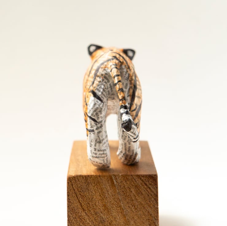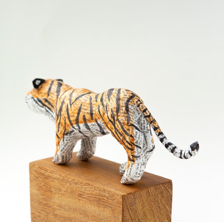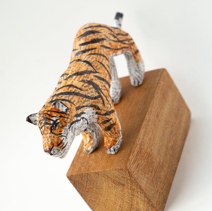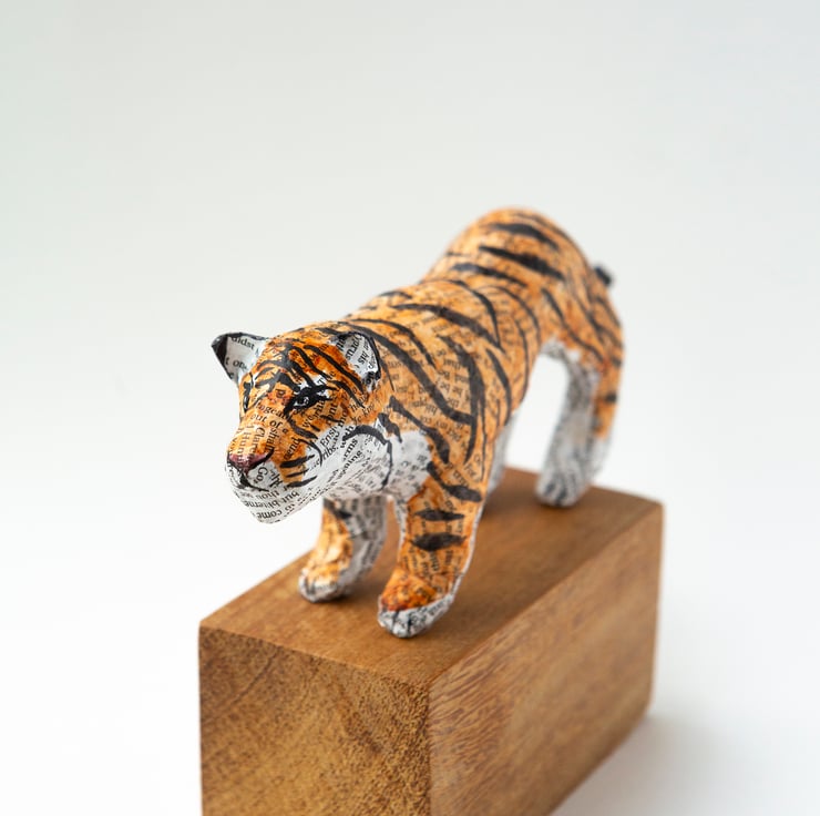 A handmade paper mache folk art sculpture of a tiger. It is created from paper mache using book paper, wire and watercolour on a mango wood base and is approx 15cm high x 21cm wide.
