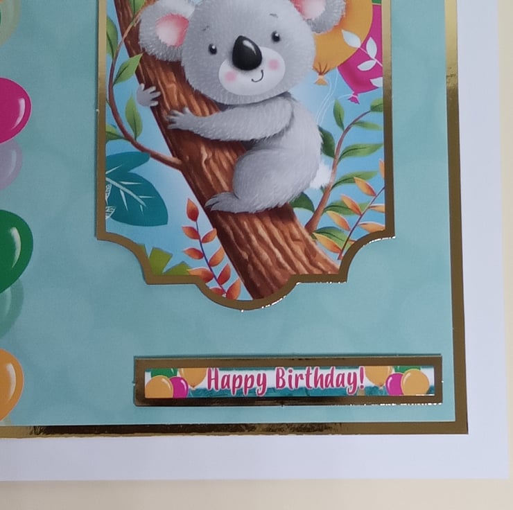 The shaped topper features an image of a Koala wearing a party hat with balloons in the background, I have placed it onto a background with a balloon border and addd a matching "Happy Birthday " greeting in the bottom right corner.