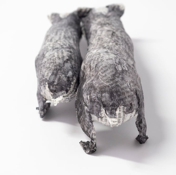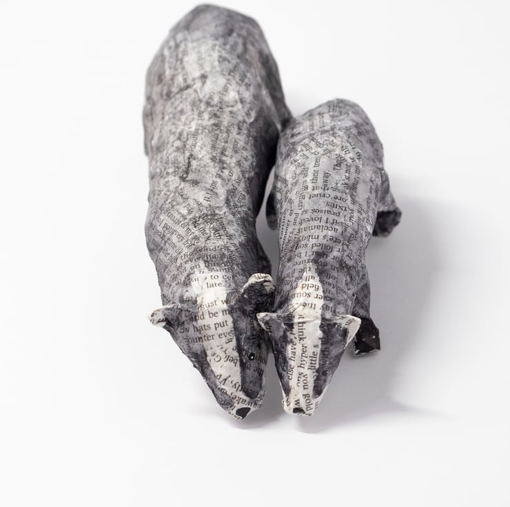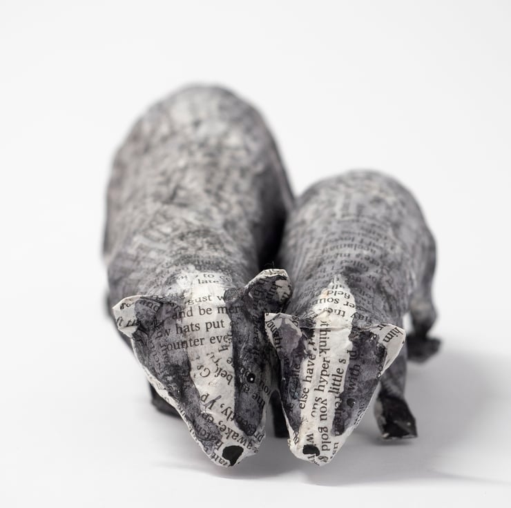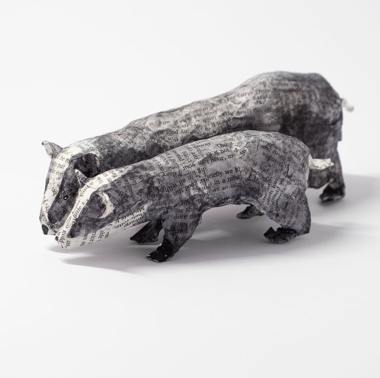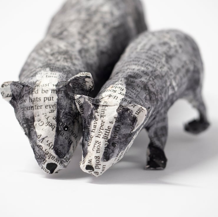 A handmade paper mache folk art sculpture of a a pair of European badgers. It is created from paper mache using book paper, wire and watercolour and is approx 5cm high x 16cm long.