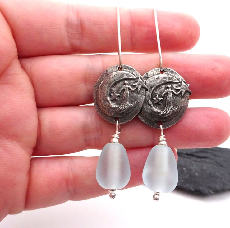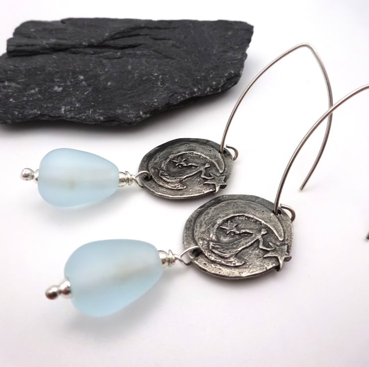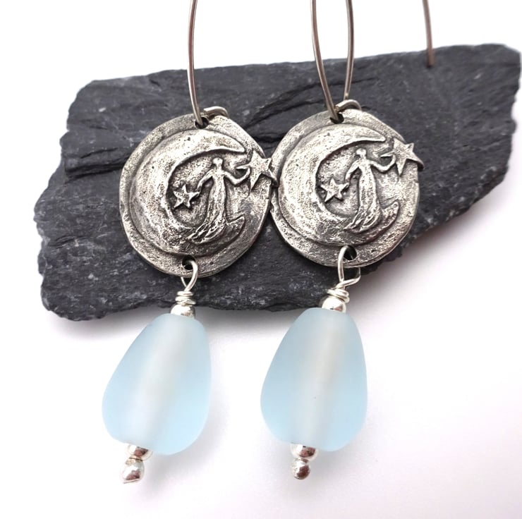 A pair of earrings made with sterling silver ear wires, handmade pewter moon goddess connectors and handmade lampwork glass blue tear drop beads.