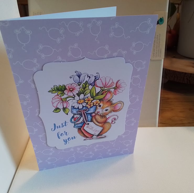 A beautiful card with a mouse holding a bucket of flowers, just for you and with love.
