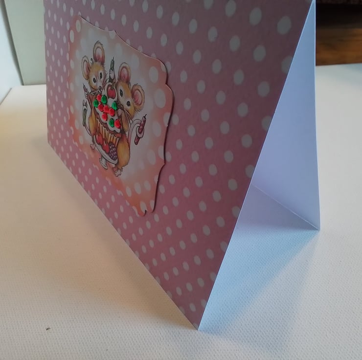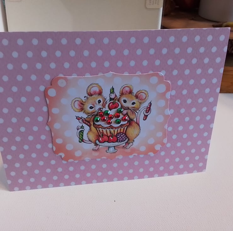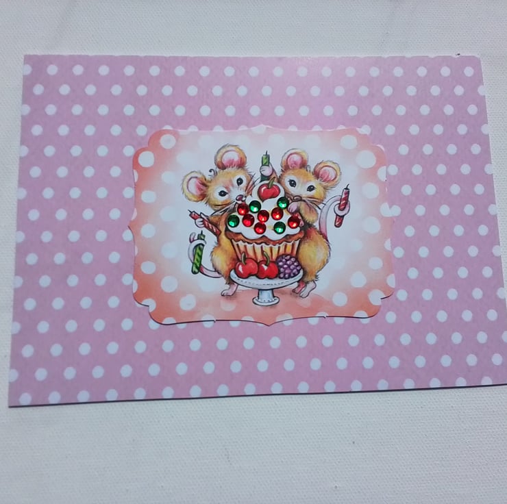 A lovely Birthday cake with a pair of mice holding a cup cake.