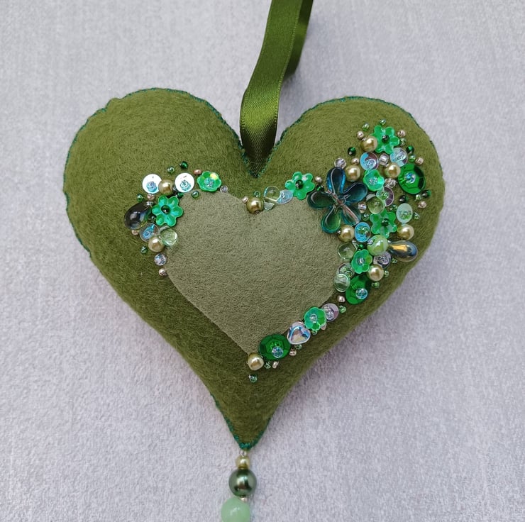 I have embellished/hand sewn the heart with a real mixture of green glass beads and sequins, plus a floral shaped acrylic bead.