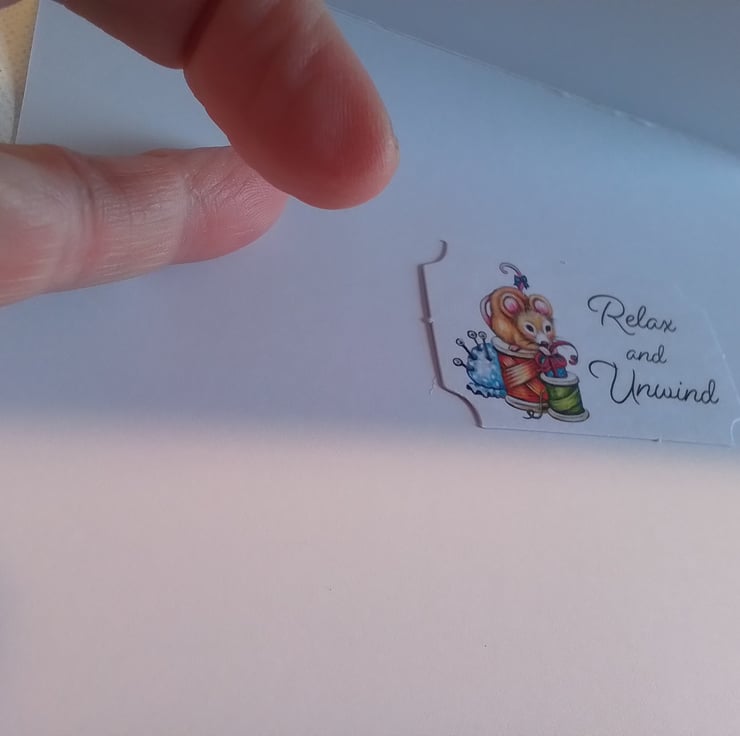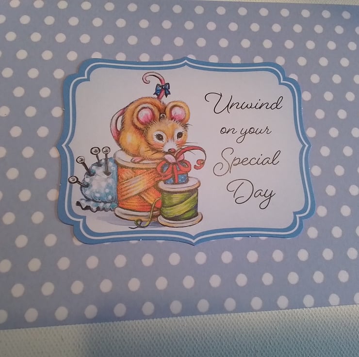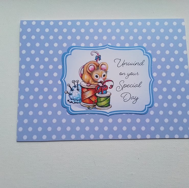 A cute card with a mouse sitting on a reel of cotton wrapping a gift.