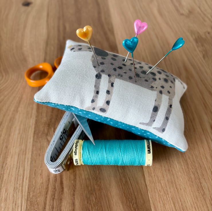 I’ve used left over fabric and cut out individual dogs to create distinctive pincushions. The front is quality furnishing cotton and the back is a coordinating bright cotton. Both fabrics are 100% cotton.