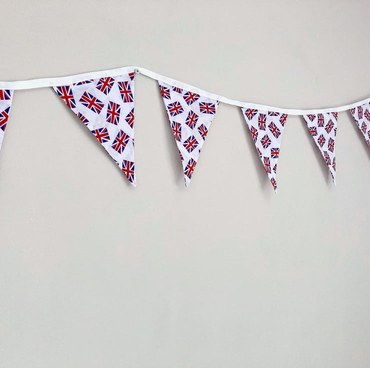 Beautifully handmade bunting. 10 polycotton flags with Union Jacks, sewn onto white cotton tape.
