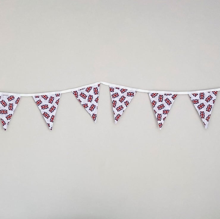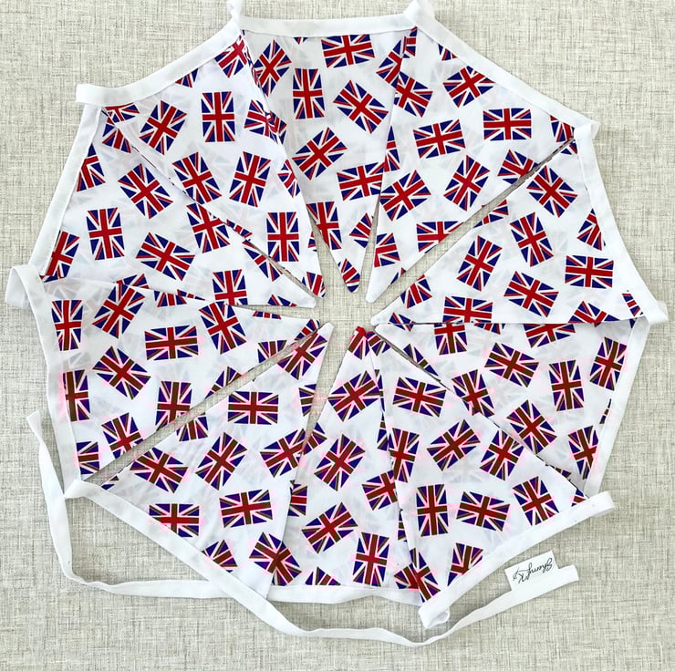 Beautifully handmade bunting. 10 polycotton flags with Union Jacks, sewn onto white cotton tape.