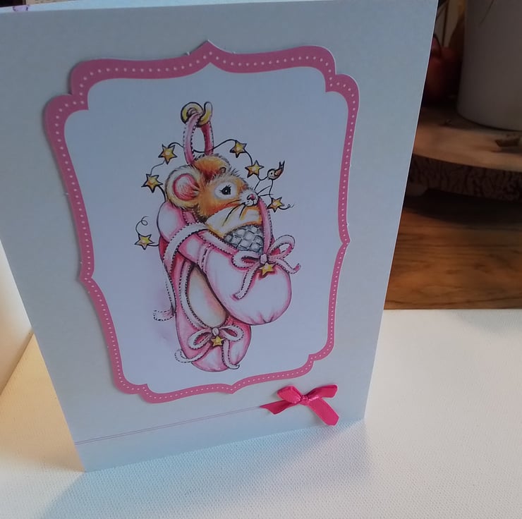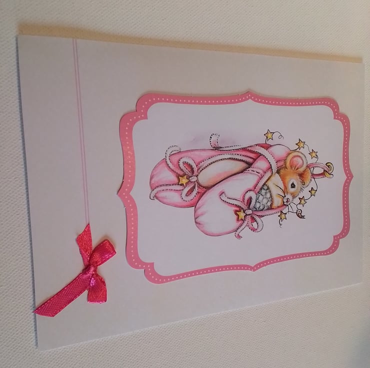 The picture has a pink border and the background of the card is in a very pale yellow.