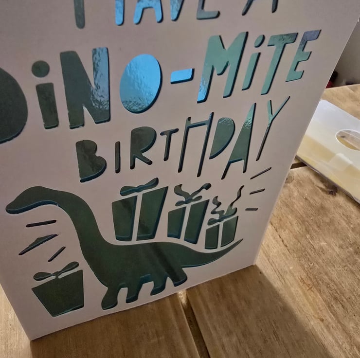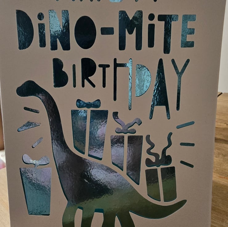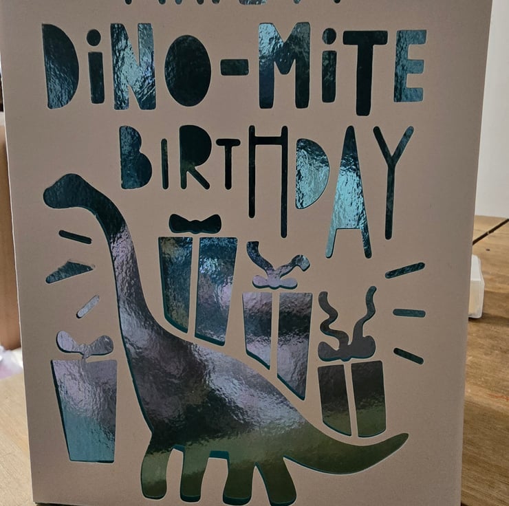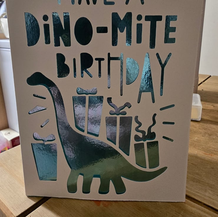 This Dino-mite handmade birthday card features a playful dinosaur design, complete with a colorful present beside it. The charming illustration brings a fun, prehistoric twist to the occasion, making it the perfect card for any dino-loving birthday celebrant. With vibrant colors and a cheerful theme, it’s sure to bring a smile to anyone’s face!