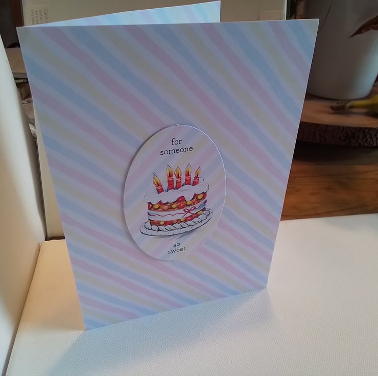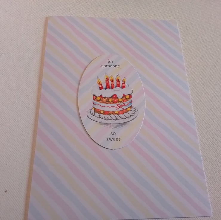 A cake, full of candles with the sentiment 'for someone so sweet' is in the centre of the pastel striped card.