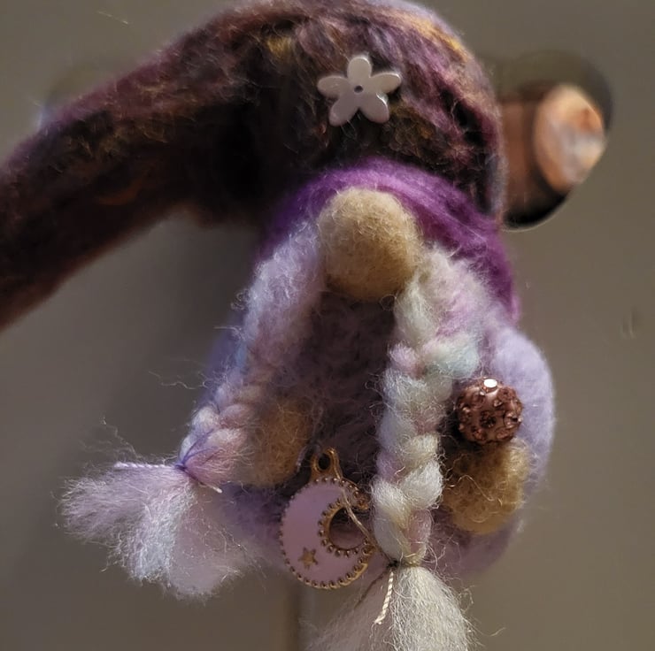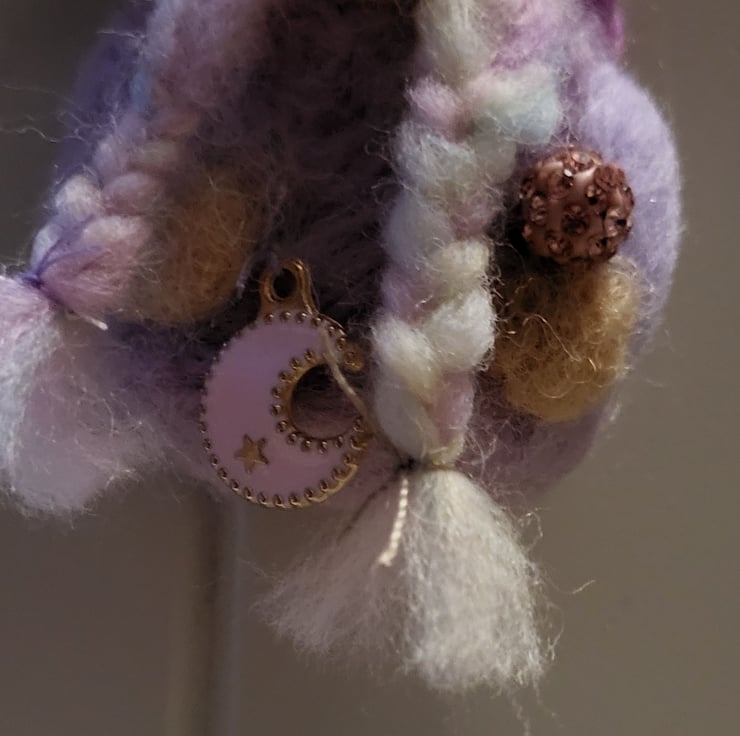 I had some lovely mixed coloured wool and a little moon charm so thought I would create a little miss with it :-)