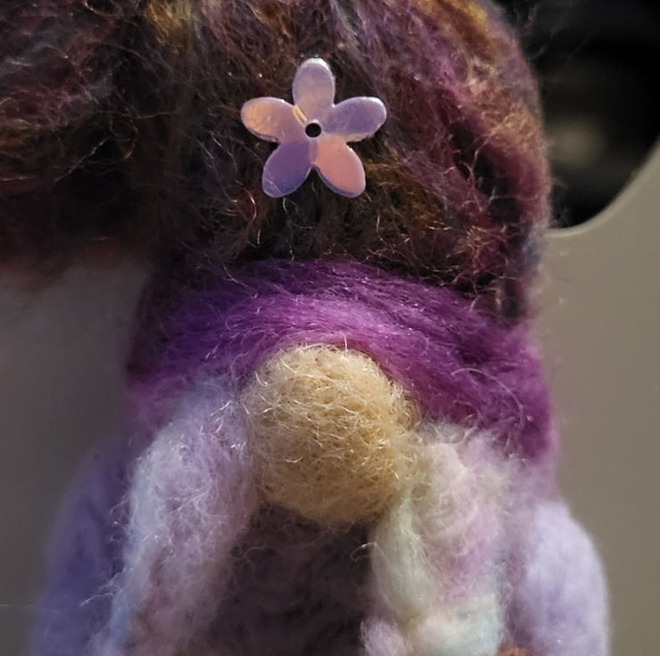 She has pastel coloured, highlighted, plaited pigtails and has a shimmering flower decorating her hat. She comes attached to a colour co originated string so you can display her straight away.