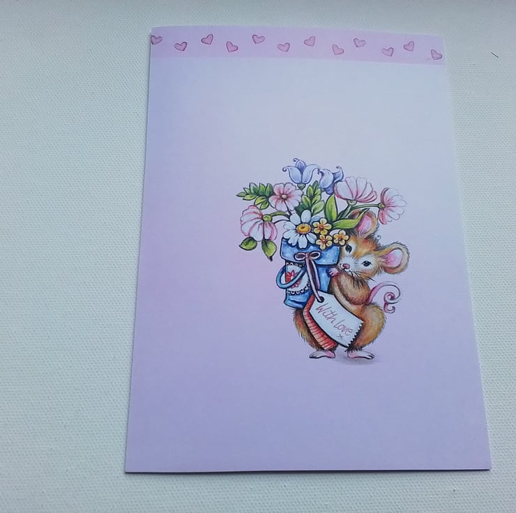 A mouse holds a big hunch of flowers with the tage saying 'with love'.