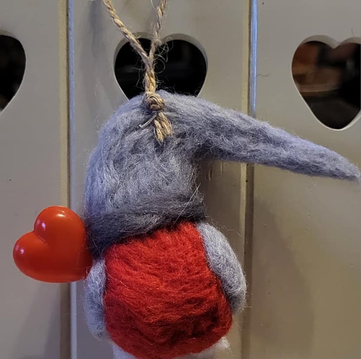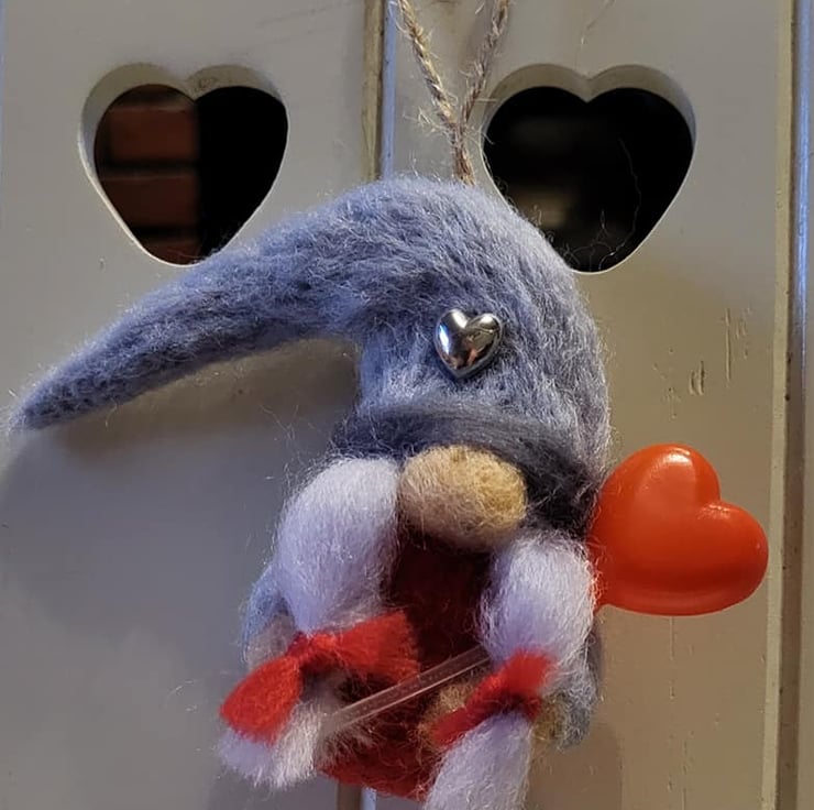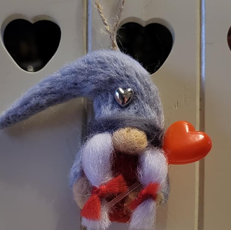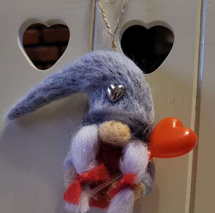 Ready for Valentines Day, this super sweet gonk has been handmade with grey and red wool. She is holding a lovely red love heart balloon and has a little silver heart on her hat.