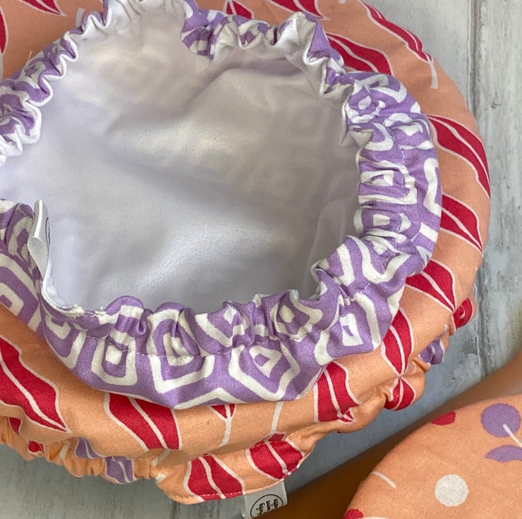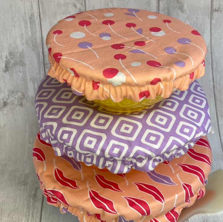 How could you resist these pretty food bowl covers? They are great for keeping food fresh and helping to reduce usage of cling film and plastic bags. Use them for covering bowls of leftovers in the fridge, keeping flies off salads before serving, covering thawing food or for keeping bread dough cosy. They are made from attractive cotton lined with white PUL – a waterproof and breathable fabric, safe for food use (more details below). The elastic hem holds the cover securely on your chosen bowl. They can be used in the fridge or freezer but not the microwave. If soiled, the lining can be wiped clean or the whole cover can be washed in the washing machine and air dried - much easier and more hygienic than beeswax wraps.