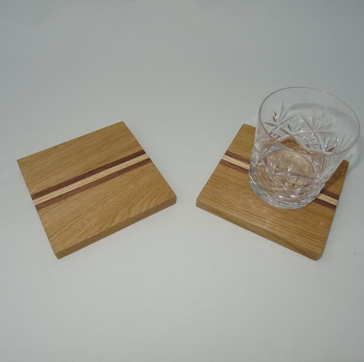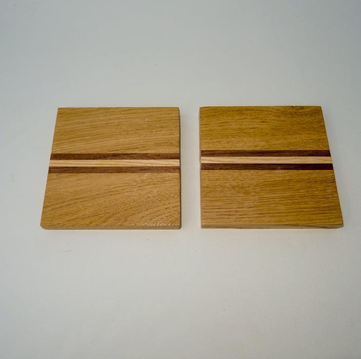 The coasters are made primarily from Oak with decorative stripes of Ash and American Black Walnut in the centre.
