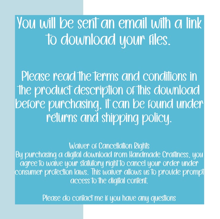 acknowledge and accept this refund policy. At Handmade Craftiness, we are committed to providing high-quality digital products. Please read our refund policy carefully before making a purchase: Waiver of Cancellation Rights By purchasing a digital download from Handmade Craftiness, you agree to waive your statutory right to cancel your order under consumer protection laws. This waiver allows us to provide prompt access to the digital content. No Refunds After Download For digital downloads, consumers are required to waive their cancellation rights before the digital content can be provided. This means that once a customer (i.e., the consumer) has downloaded the content, they have given up their consumer rights to a refund. This policy aligns with consumer law for digital goods, ensuring the protection of intellectual property and preventing unauthorized distribution. Cancelling a Digital Download Under the Consumer Contracts Regulations 2013, digital downloads are neither goods nor services, meaning the law is a little different. If you want to download something within 14 days of buying it (known as the 'cooling-off’ period), you must give your consent to waive the 14-day cooling-off period. If you do not give your consent, the 14-day cooling-off period still applies. However, you will not be able to download your digital content until this period has ended. This policy exists to prevent customers from changing their minds after downloading the content. As you are being sent a link via email to download after purchase this will count as downloading the content as you will have access to download the files from the email. Eligibility for Refunds Refunds may only be issued under exceptional circumstances, such as: The digital content is proven to be defective or incomplete. An error on our part (e.g., duplicate billing). Contact Us If you believe you are eligible for a refund due to one of the exceptional circumstances above, please contact us at orders@handmadecraftiness.co.uk with your order details, a description of the issue, and proof of purchase. Our team will review your request and respond within 7 business days. For further inquiries, please contact us at orders@handmadecraftiness.co.uk. ------------------------------------------------------------------------------------------------------------------------------------------------------------- Ownership and Usage: All artwork within this shop is the exclusive property of Handmadecraftiness. You are expressly prohibited from reproducing, altering, redistributing, reselling, or claiming ownership of any digital item from this store. However, you are permitted to incorporate products from this store into your own physical handmade items for sale as a hobbyist. TERMS OF USE 1. You may print and use these items in a tangible journal/scrapbook/craft project etc. 2. You MAY NOT sell or share these files. 3. You MAY NOT reproduce/altar/redistribute our designs as a digital or physical item. 4. You MAY NOT sell or manipulate these files for resale purposes. 5. You MAY NOT share these files individually or as kits.