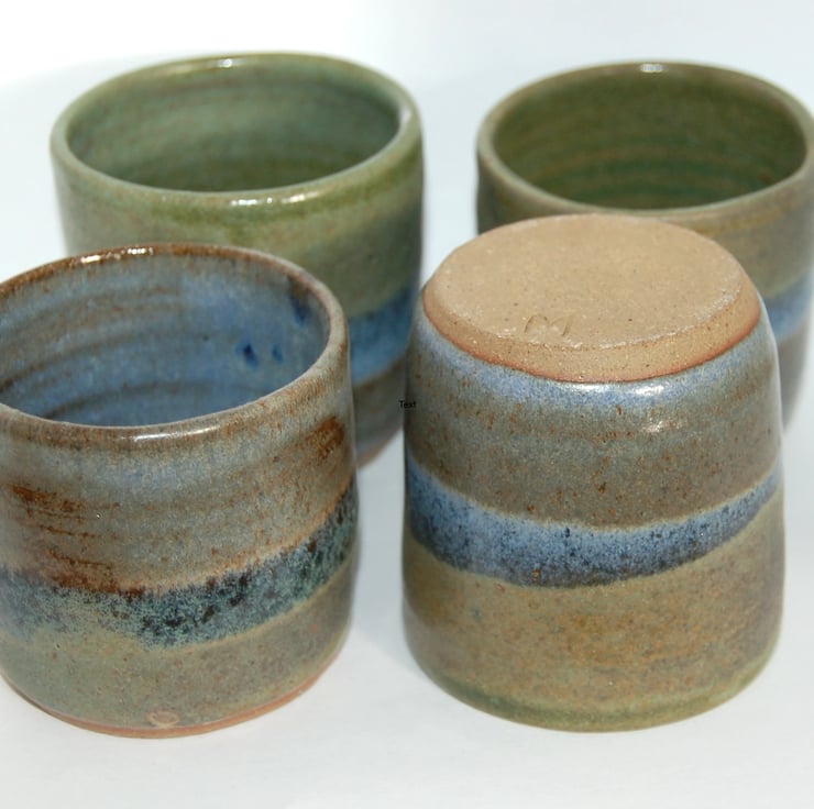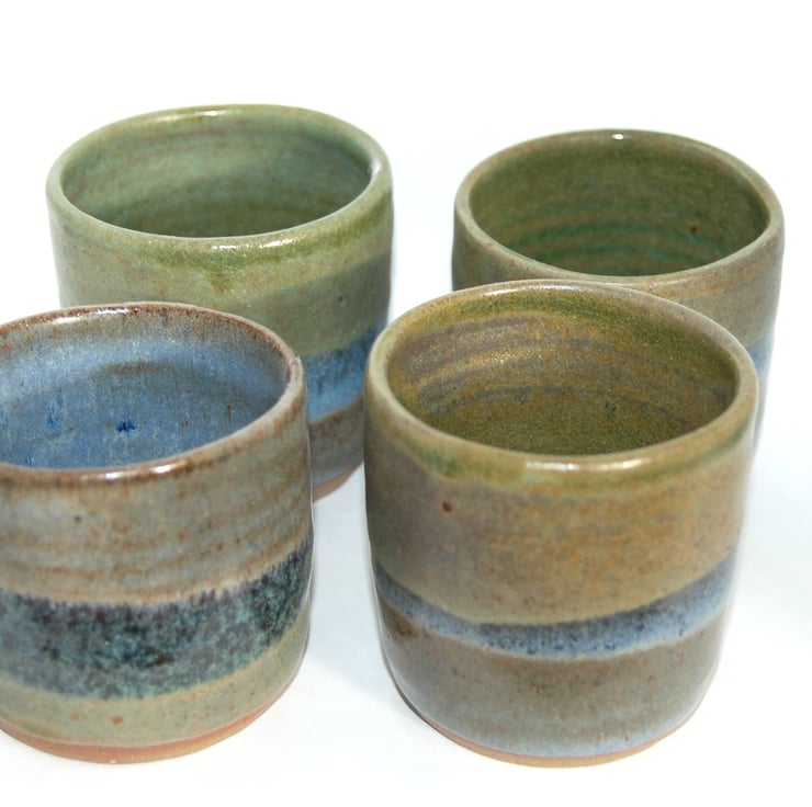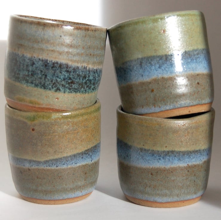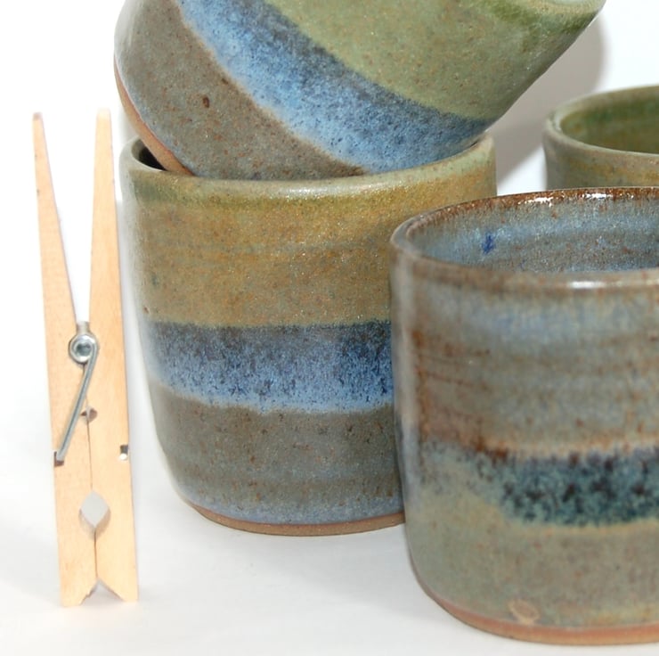 Ceramic cup 90 ml capacity. The toasted stoneware clay cup is double dipped in two glazes and each cup is unique. These pretty cups can be sold as planters.