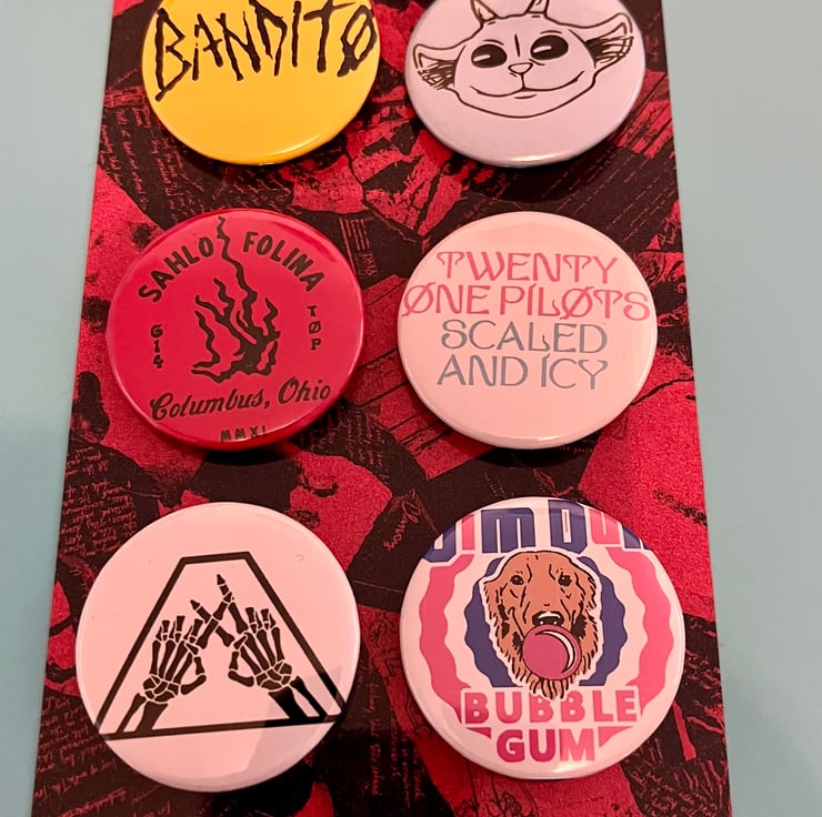 Contains 12 badges with different designs on a clancy themed backing card.