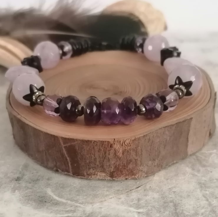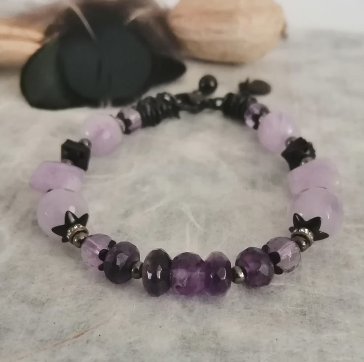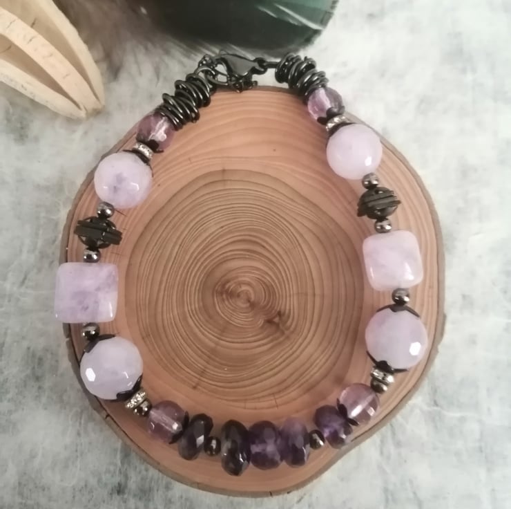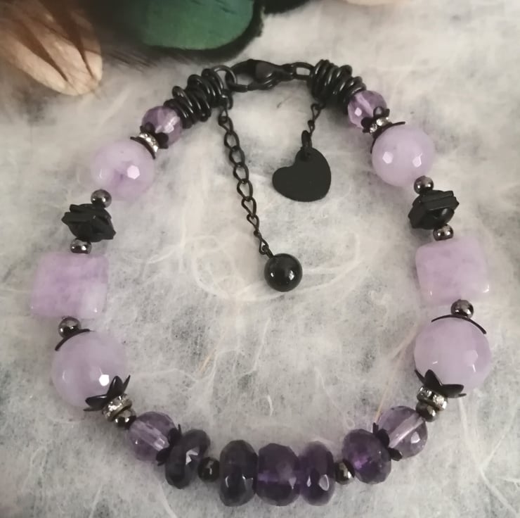 The bracelet was designed by me with different shapes and textures of amethyst gemstones. I have used black findings, bead caps etc for a striking new look.
