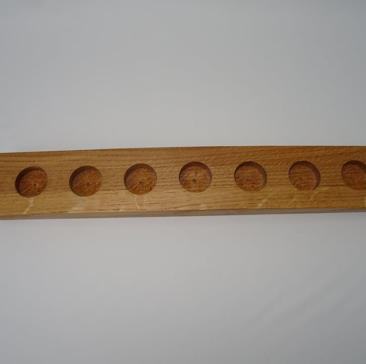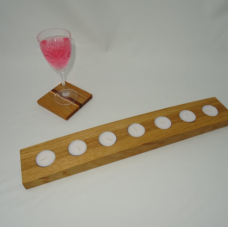Ideal for the centre piece on a dining table, or to decorate an mantle piece. This tealight holder is made from solid Oak.