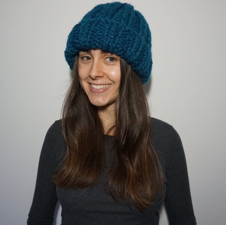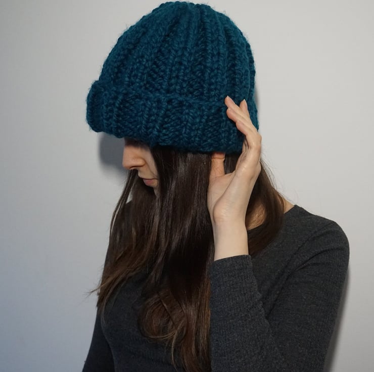 Women's Teal Extra Soft Chunky Knit Rib Stitch Handmade Beanie Hat with Wide Brim For Sale.